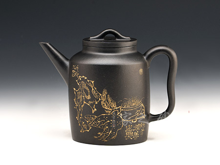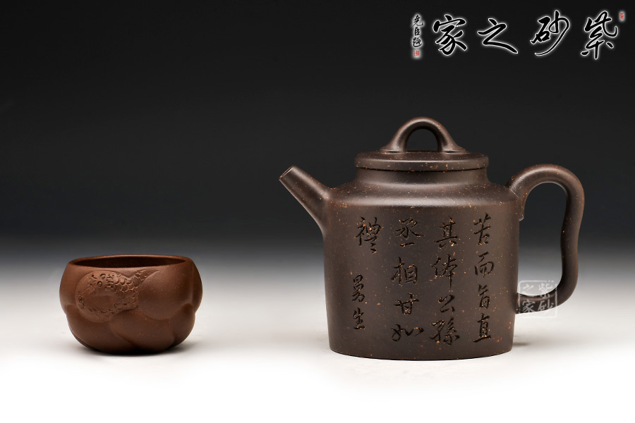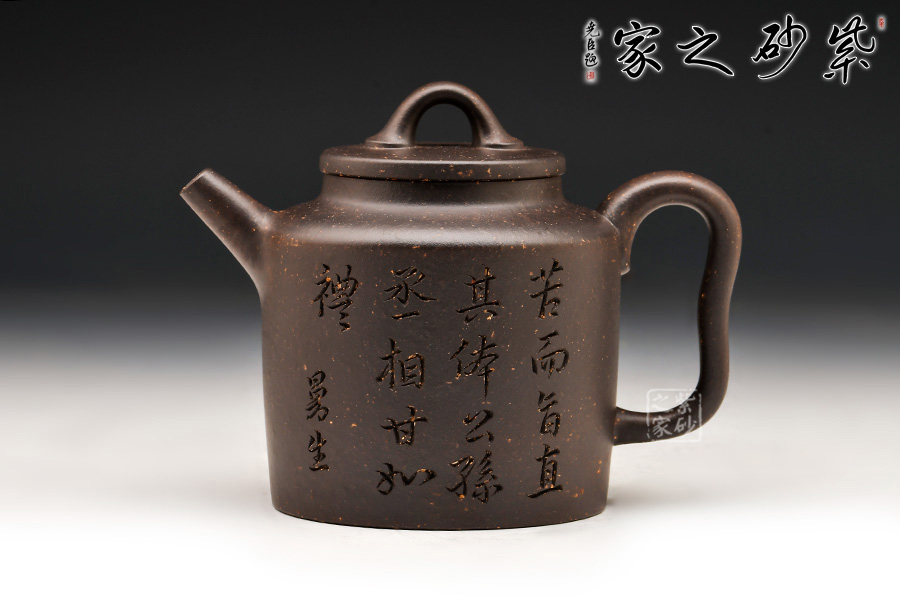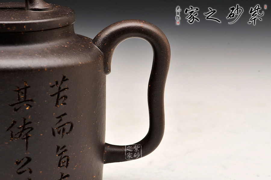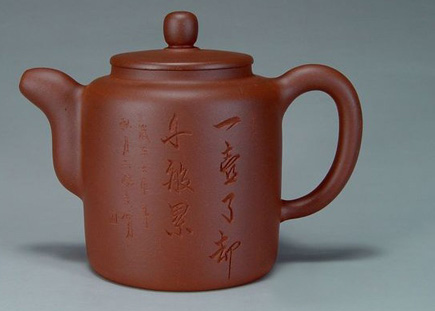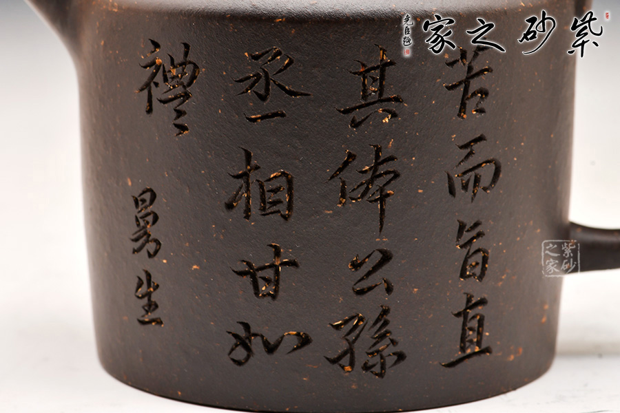 壺身造型筒練至極,質(zhì)樸無華,挺括而豐富的壺身表面,銘文詩詞的刻繪裝飾,沉穩(wěn)而含蓄的色彩,構(gòu)成造型的藝術(shù)表現(xiàn)力。