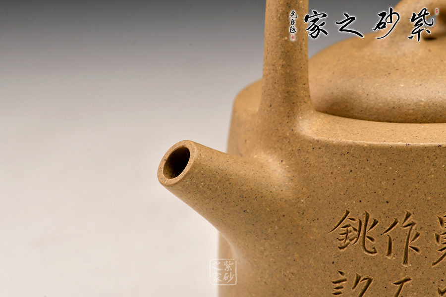 橋紐,蓋微穹,提梁硬朗而不失柔潤(rùn),與壺身的銜接舒坦自然。壺嘴直而俏,挺俏大方,見(jiàn)壺便知鬼斧神工。