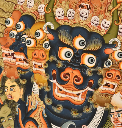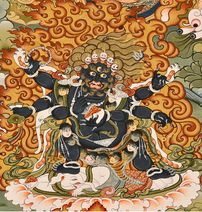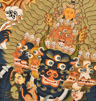 產地:熱貢 工藝:彩唐 創作年份:2020 題材:大威德金剛 繪制時間:3月 尺寸:*78*110cm 裝裱: 材質:織面 使用場地: