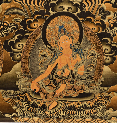 | 唐卡是歷史的瑰寶,現已被例入國家非物質文化遺產名錄,得到了高度的重視和保護。同時由于顏料的珍稀、繪制周期長、工藝復雜大大增強了其珍藏價值。一幅好的作品可遇不可求,近年來唐卡已成為收藏界炙手可熱的藏品。 | 唐卡的形式便于攜帶,其內容體現了藏傳佛教的莊重、神圣、華貴,被稱為“移動的佛像”。同時也是修行者積累善業,追尋心靈的平靜與安寧的一個過程。 | 唐卡的內容包羅萬象,它以圖像的方式承載著藏族文化精髓,是藏族智慧的結晶,廣泛傳播了藏地的文化、歷史和宗教理論。 | 唐卡絢麗的色彩、流暢的線條、嚴謹的結構,都充滿著濃郁的高原和游牧民族風情,無疑是難得的藝術珍品。值得一提的是唐卡繪制顏料全部為天然礦物顏料,畫面效果艷麗,可以保存千年而不變色。 |