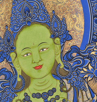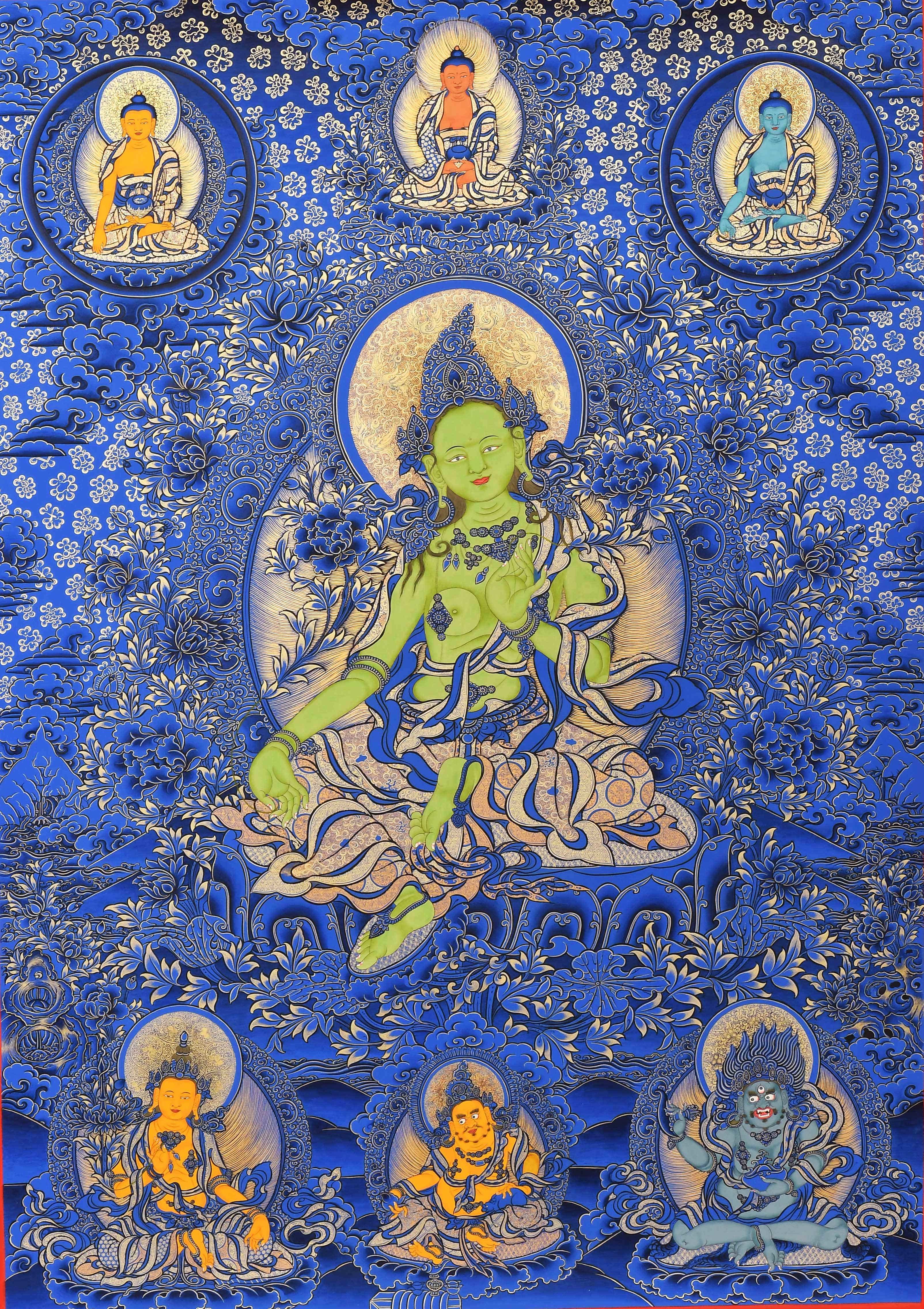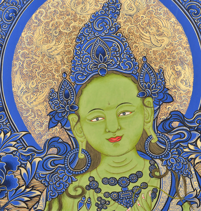 產地:熱貢 工藝:藍唐 創作年份:2020 題材:綠度母 繪制時間:3月 尺寸:*70*100cm 裝裱: 材質:織面 使用場地: