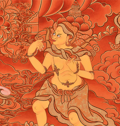 此幅唐卡位朱紅唐卡,用朱砂、胭脂等天然礦物、植物顏料著色,可歷經(jīng)千年不褪色。