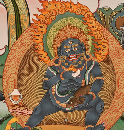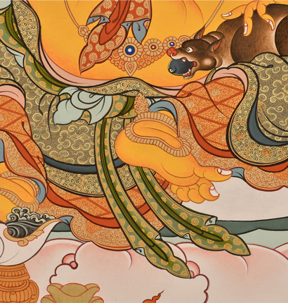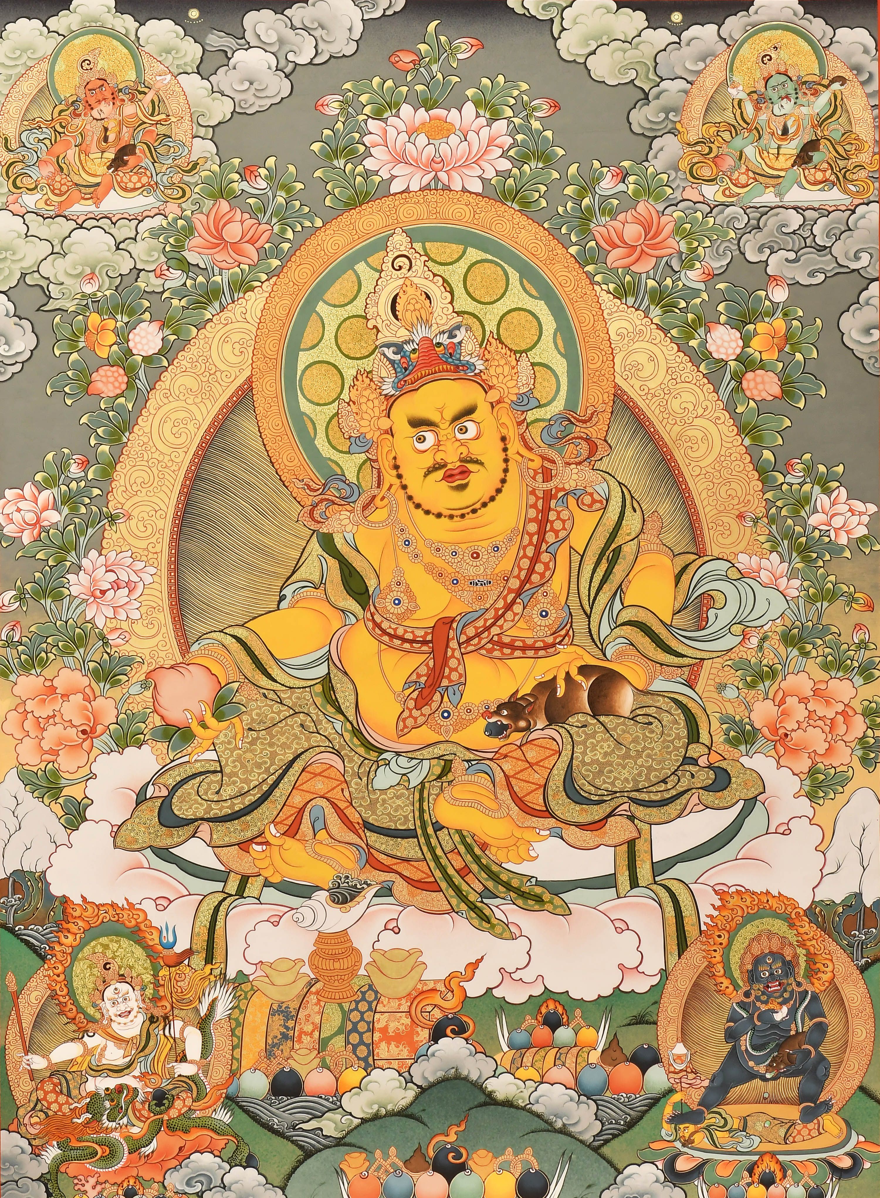 黃財神為五路財神之首,黃財神的形象為上身袒露,下身著裙,右手持摩尼寶,象征寶光普照十方,增添眾生的福報;左手抱一只大貓鼬(吐寶鼠),鼬的嘴里含著珠寶,象征財寶。右腳踏一只白色海螺,象征著他能入海取寶。