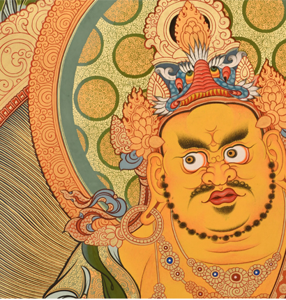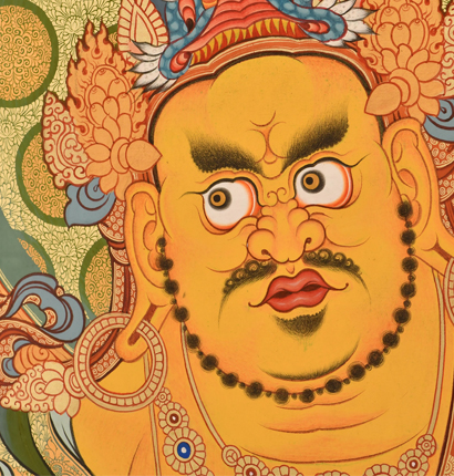 產地:熱貢 工藝:彩唐 創作年份:2020 題材:黃財神 繪制時間:3月 尺寸:*66*90cm 裝裱: 材質:織面 使用場地: