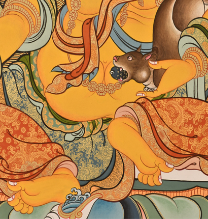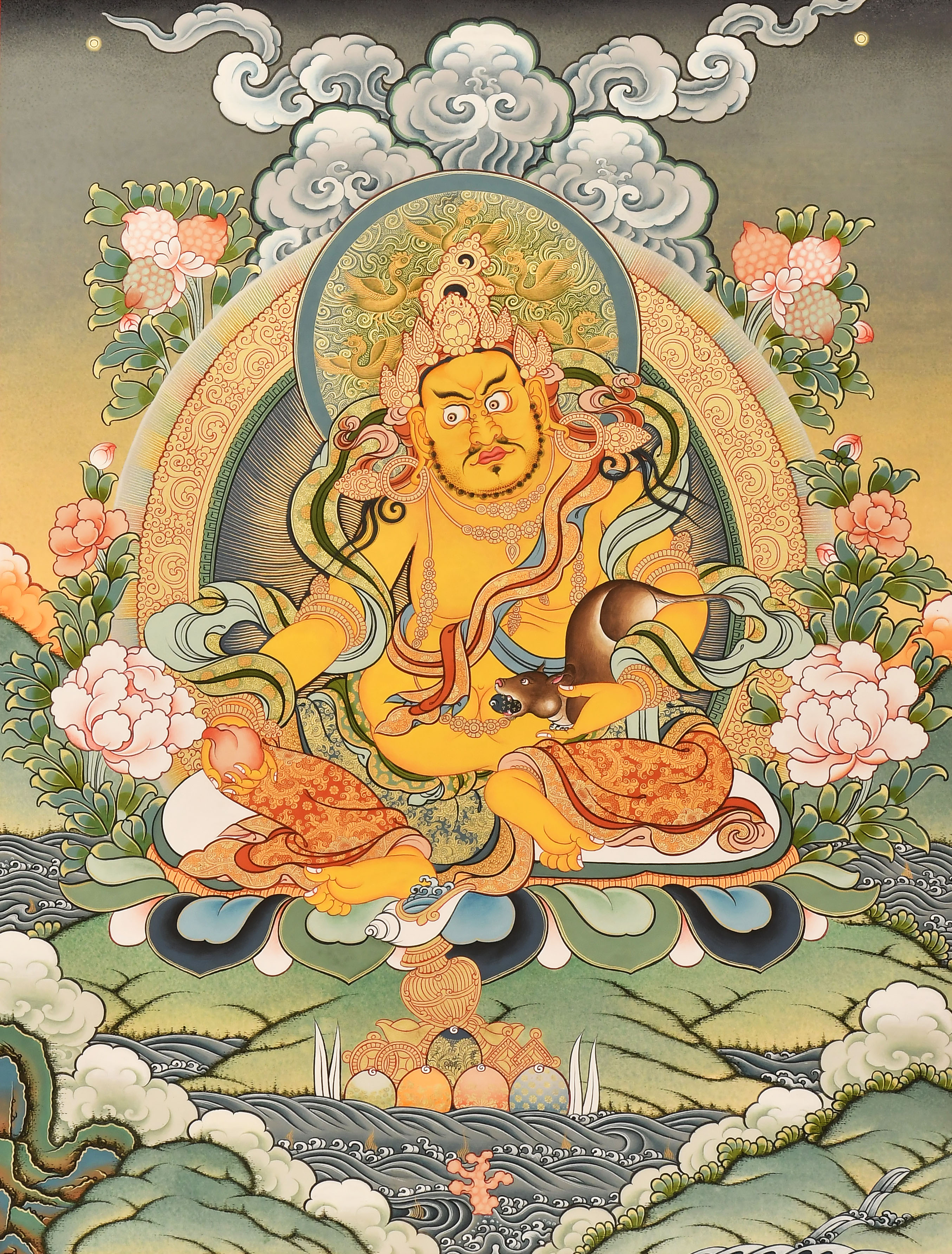 黃財神為五路財神之首,黃財神的形象為上身袒露,下身著裙,右手持摩尼寶,象征寶光普照十方,增添眾生的福報;左手抱一只大貓鼬(吐寶鼠),鼬的嘴里含著珠寶,象征財寶。右腳踏一只白色海螺,象征著他能入海取寶。