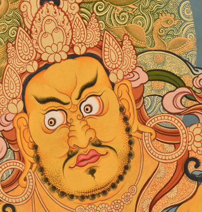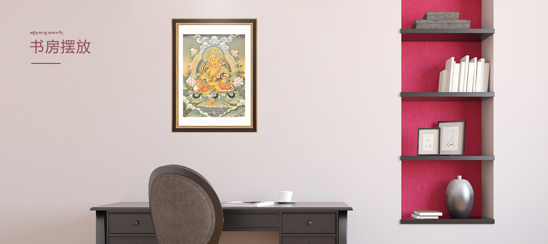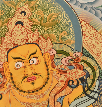 產(chǎn)地:熱貢 工藝:彩唐 創(chuàng)作年份:2020 題材:黃財神 繪制時間:2月 尺寸:*58*74cm 裝裱: 材質(zhì):織面 使用場地: