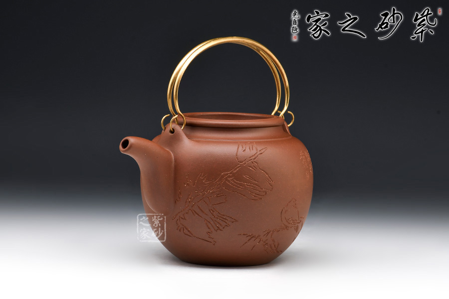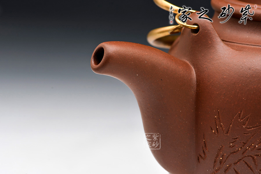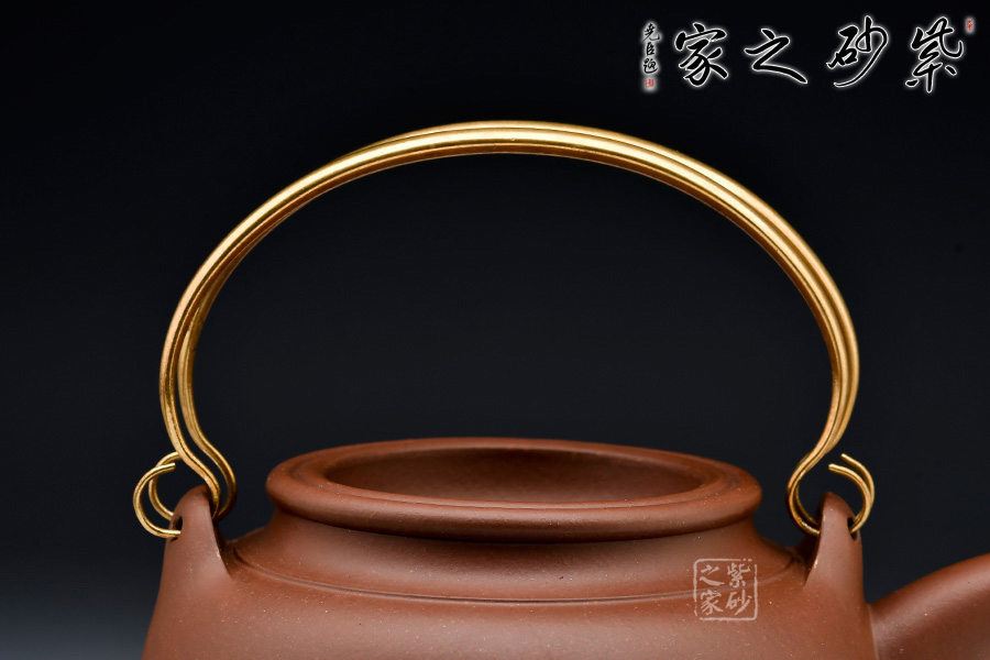 壺身為扁球體,光滑飽滿,顯示雍容典雅之氣質(zhì)。壺蓋一改以往設(shè)計(jì)風(fēng)格,向內(nèi)凹進(jìn),口蓋齊整,線條順滑,無壺鈕設(shè)計(jì),與壺身融為一體。壺嘴捏制精確,為三彎式構(gòu)造,嘴腹粗大至嘴口突然收縮成小圓口,出水便利、不滴水流。提梁為純銀打造,形似虹橋橫架于壺肩之上,在色調(diào)和造型上為整體增加了一份生氣和別致。