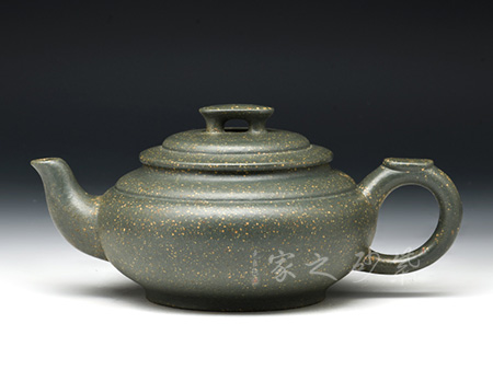 壺身呈扁圓形,折腹圈足,曲流,環(huán)狀柄,柄有寸貼,以便手指著力,匠心獨運。壓蓋式,橋形鈕,蓋部及肩部均以凹線分割,自上而下以觀,環(huán)環(huán)相扣之感。