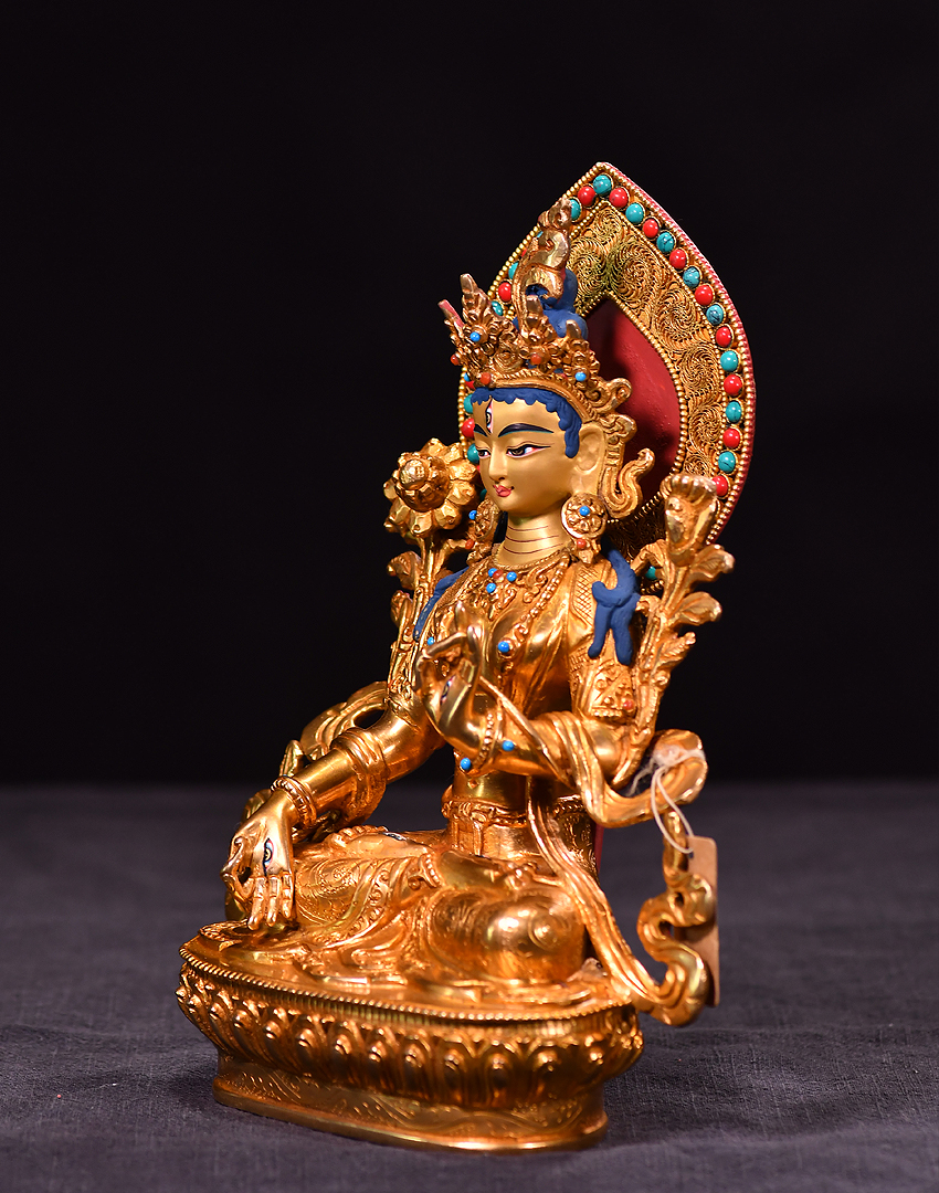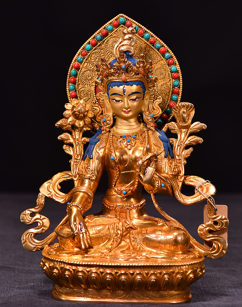 產地:尼泊爾佛像 工藝:鎏金 創作年份:2020 題材:白度母 繪制時間:0日 尺寸:*23cm 重量:0 g 材質:紫銅 使用場地: