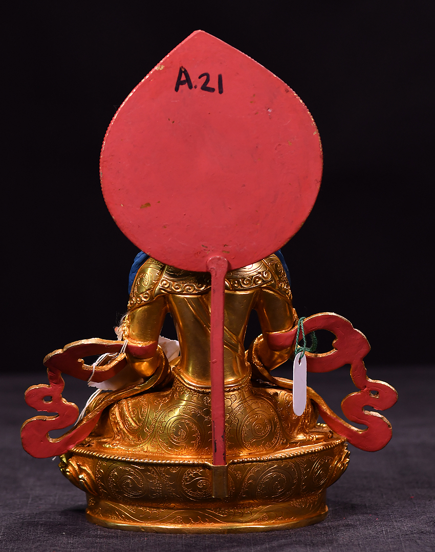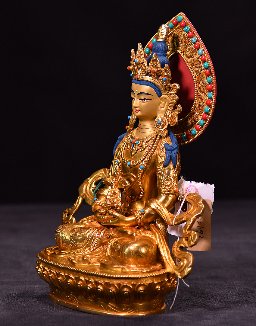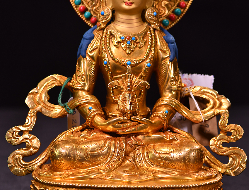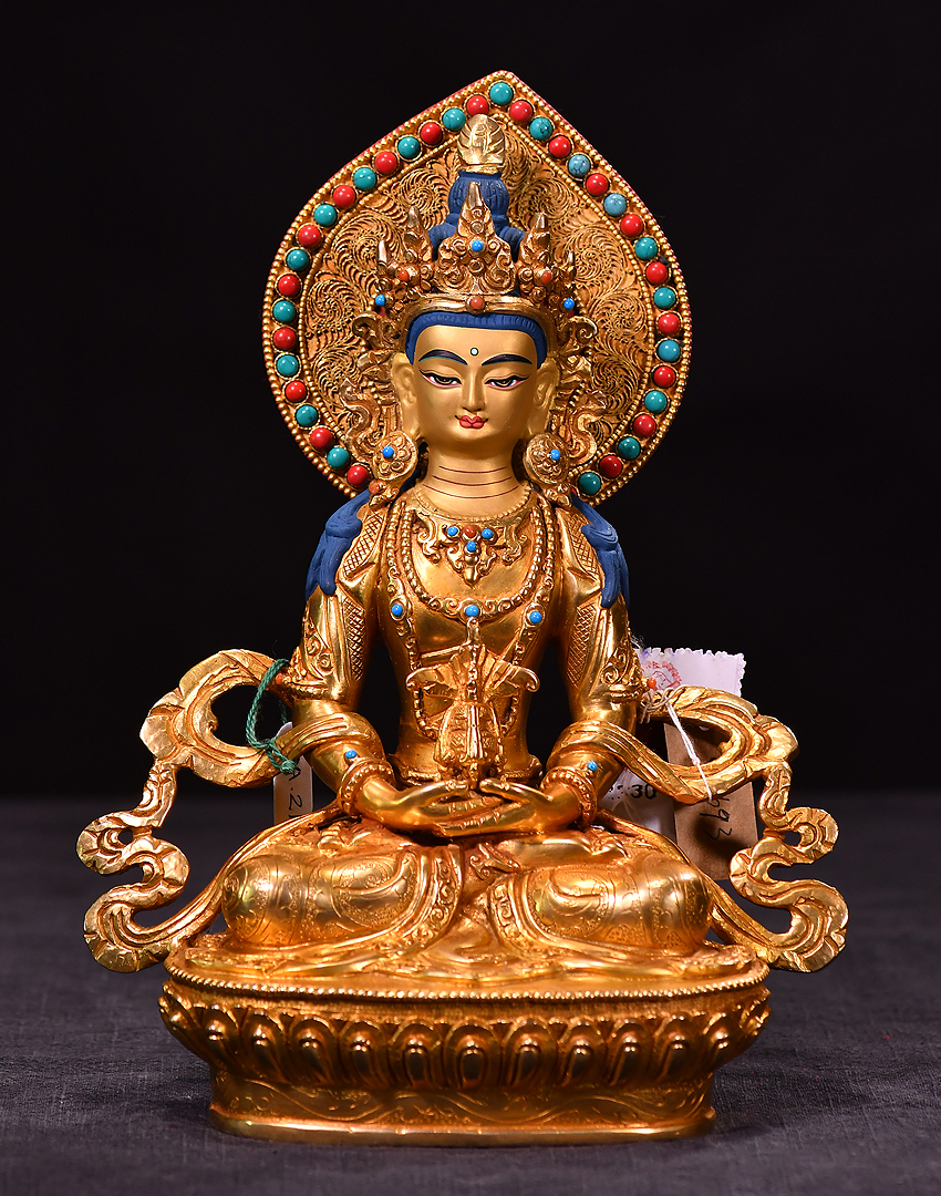 產地:尼泊爾佛像 工藝:鎏金 創作年份:2020 題材:長壽佛 繪制時間:0日 尺寸:*23cm 重量:0 g 材質:紫銅 使用場地: