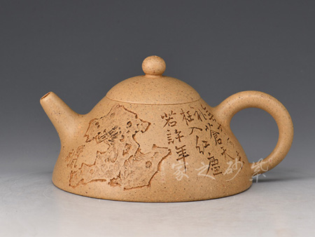 宜興紫砂以古樸素雅、宜茶等特點(diǎn)呈現(xiàn)于世人面前,又以獨(dú)特的制陶工藝、詩詞、書畫、篆刻相兼于一體的茶具,成為茶文化的組成部分。鑒賞宜興紫砂壺人們通常以“泥、形、工、飾”來衡量一件紫砂作品。劉一飛老師此專業(yè)全面,設(shè)計(jì)制陶、陶刻,尤擅裝飾,花鳥魚蟲、人物、山水無一不能,他主張?zhí)湛坍?dāng)講究“刀感” “筆意” 筆筆有意、刀刀見鋒,所刻內(nèi)容應(yīng)與器皿相得益彰,又力求能與把玩者之間產(chǎn)生共鳴為上品,他所刻的梅、蘭、菊似有暗香浮動(dòng),茗香、花香、數(shù)桿修竹又似一縷清風(fēng)拂面,好不愜意。人物兼工帶寫生動(dòng)詼諧,似能與之家長里短。山水汲古人之風(fēng),丘壑亭閣、古木參天,人與自然共存共榮,如此佳境都源于老師多年書畫基礎(chǔ)。