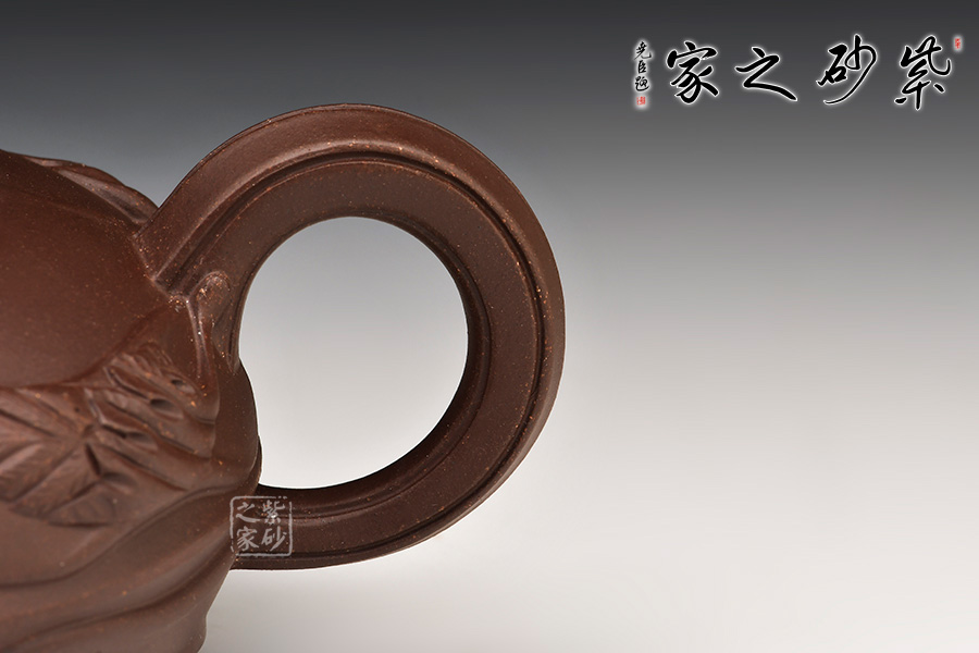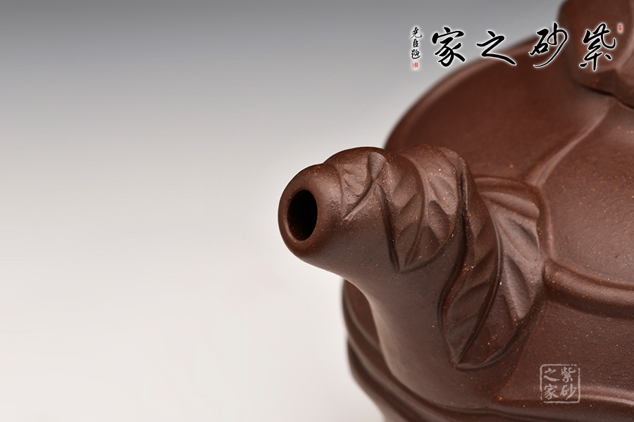 造型以仿真象生類(lèi)風(fēng)卷葵為形。圖案規(guī)則生動(dòng),曲線順和流暢,形態(tài)自然逼真,整體端莊大度,風(fēng)格古樸雅致。流卷葵葉,鈕飾葵干,把以葵莖枝葉扭曲延伸,與壺身、壺蓋所飾筋、紋、葉、莖協(xié)調(diào)和諧,器形手工藝砂味十足,韻味濃厚,為當(dāng)今紫砂界所公認(rèn)的傳統(tǒng)經(jīng)典之作。