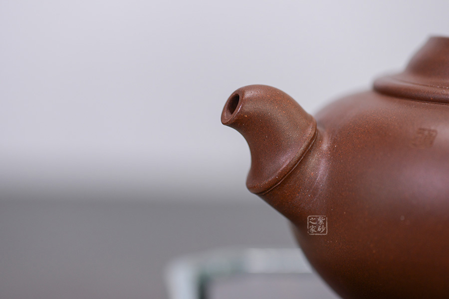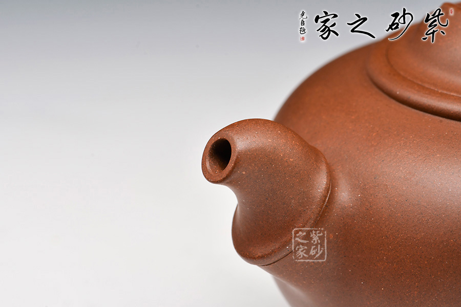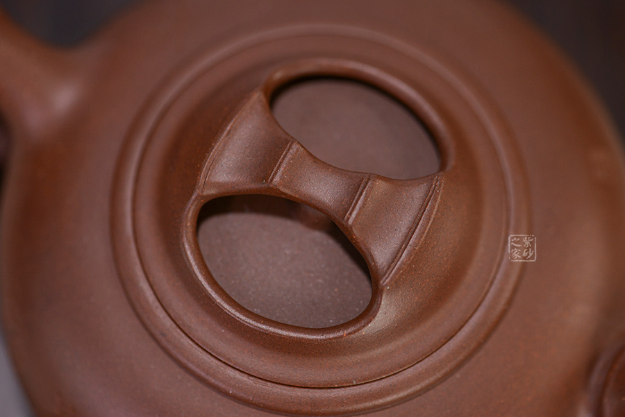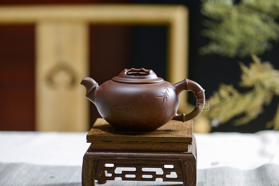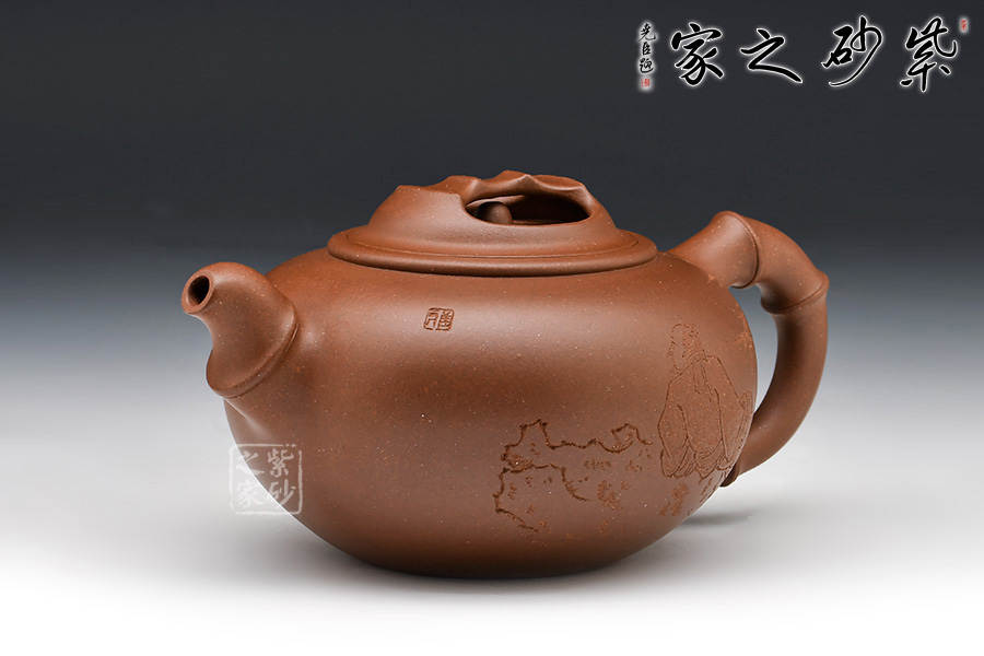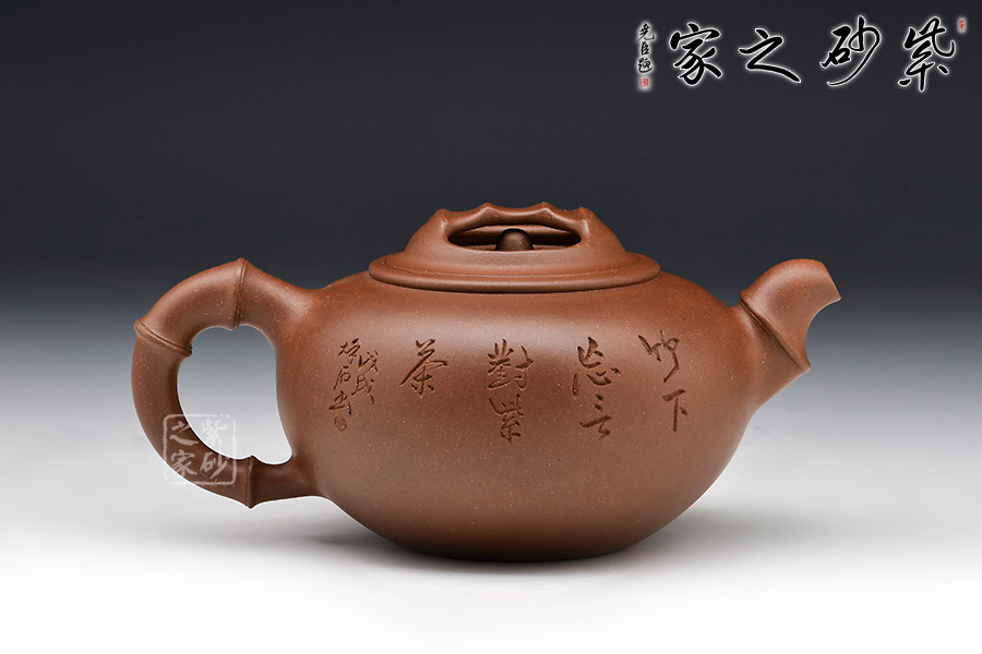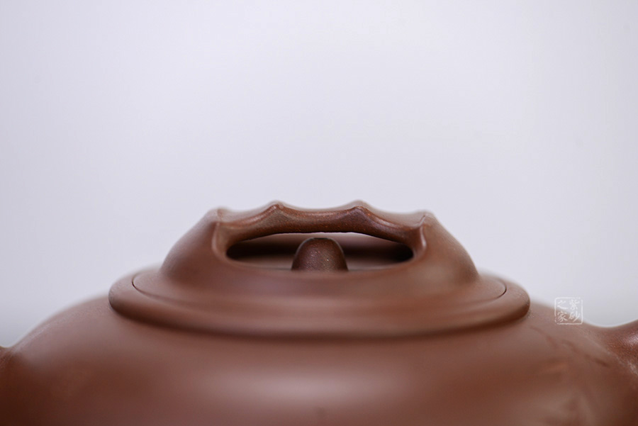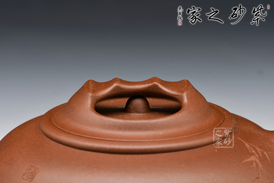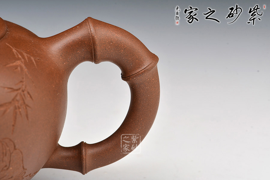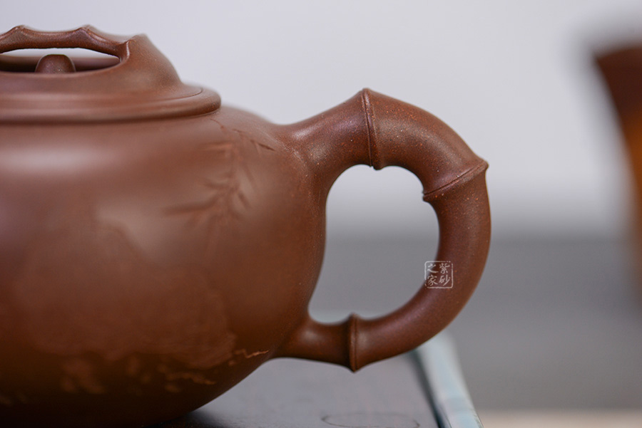 當(dāng)今紫砂藝人以竹為造型題材創(chuàng)作的壺式較為廣泛,文人氣息、藝術(shù)感強(qiáng)。此壺圓潤(rùn)飽滿的扁圓身,流、鈕、鋬飾以竹節(jié)狀,蜿蜒延伸,渾厚內(nèi)蘊(yùn)。尤其壺鈕設(shè)計(jì)新穎別致,極為少見,儀態(tài)稚秀。全器簡(jiǎn)練渾厚,泥料罕見,工藝精湛,宛若天成。