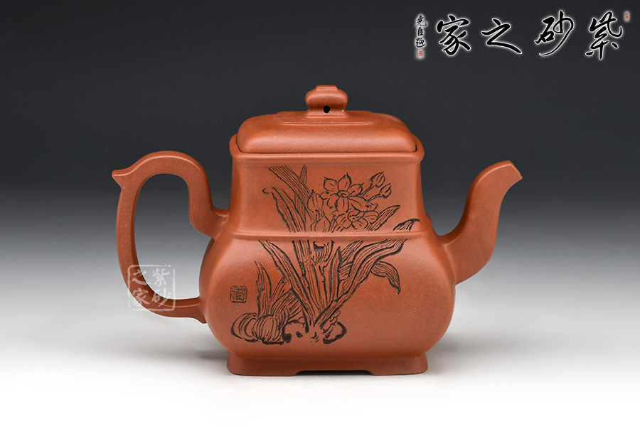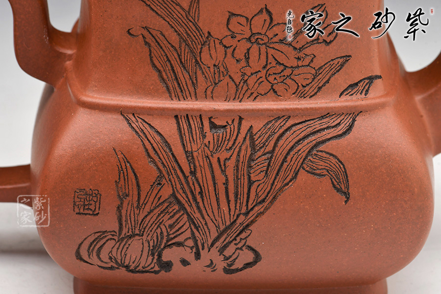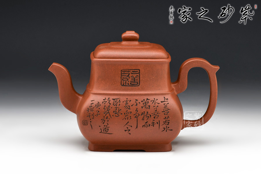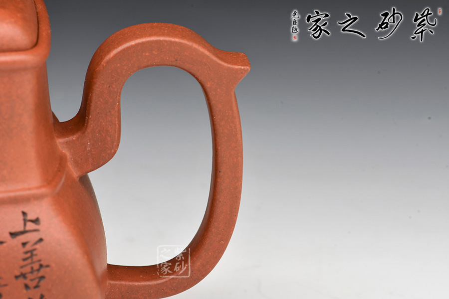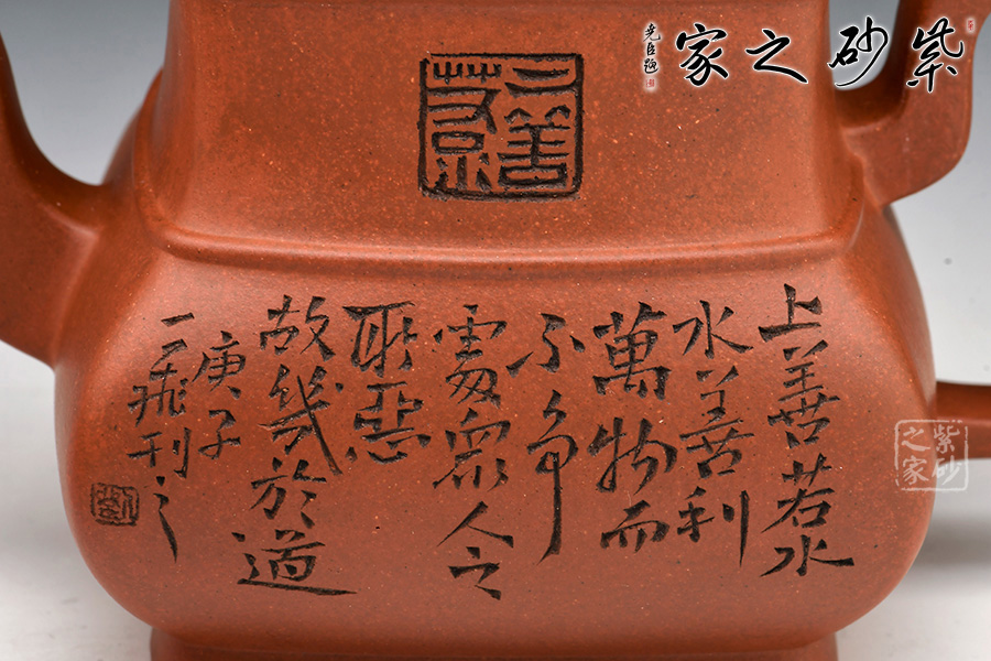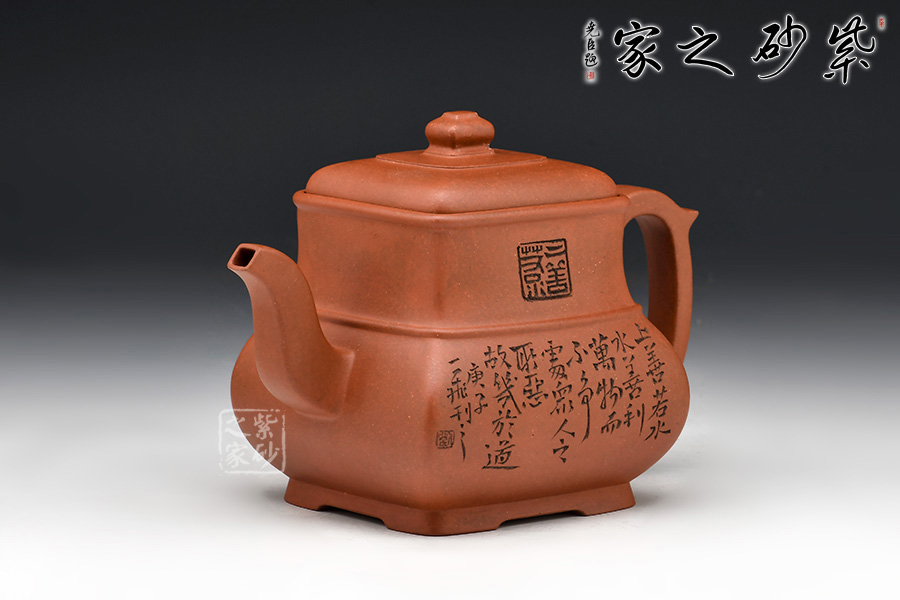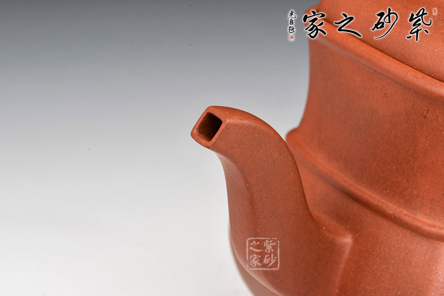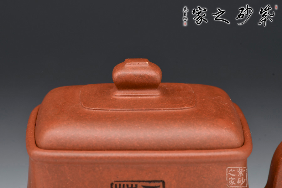 此壺氣勢(shì)恢宏,壺面呈四方,折角呈圓弧過渡,鼓腹飽滿。彎流式胥出,四方壺把,蓋面微穹,四方扁珠鈕,底設(shè)圈足。此壺身線條圓潤(rùn),過渡自然,做工精細(xì),方中有圓,剛?cè)岵?jì),品茗收藏皆宜。
