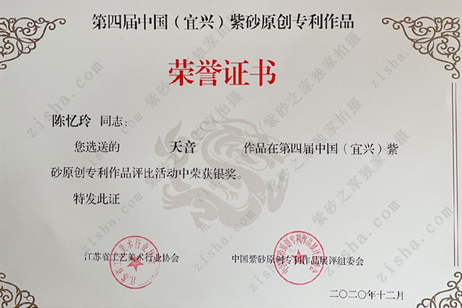 2020年11月,陳憶玲制作的《天音》紫砂壺獲得“外觀設(shè)計(jì)專利”證書;