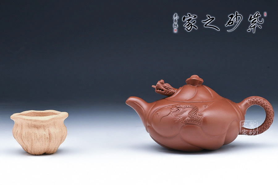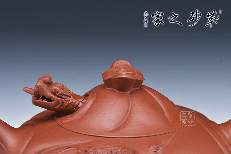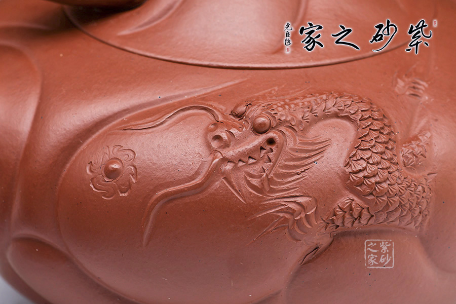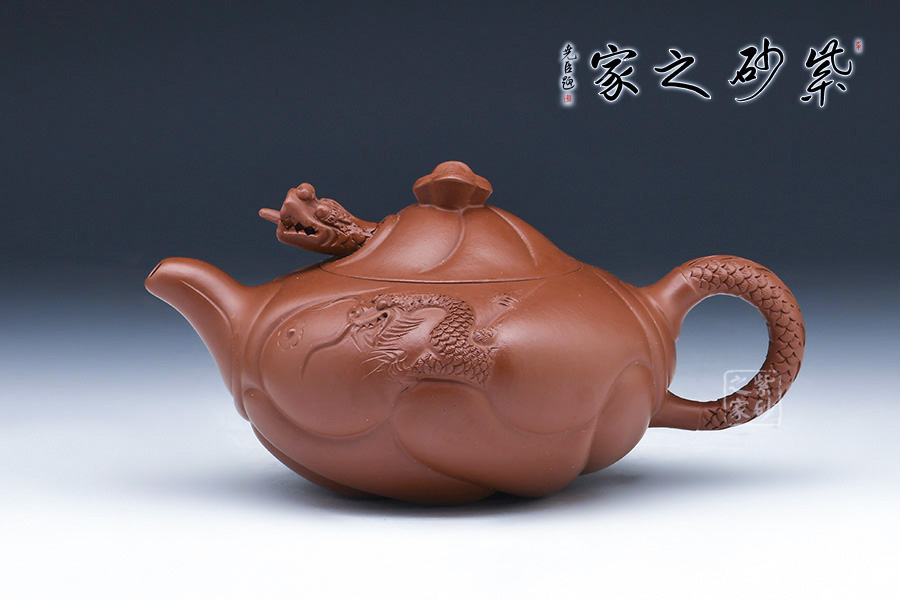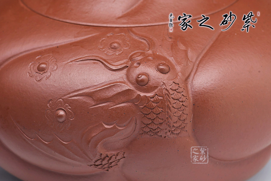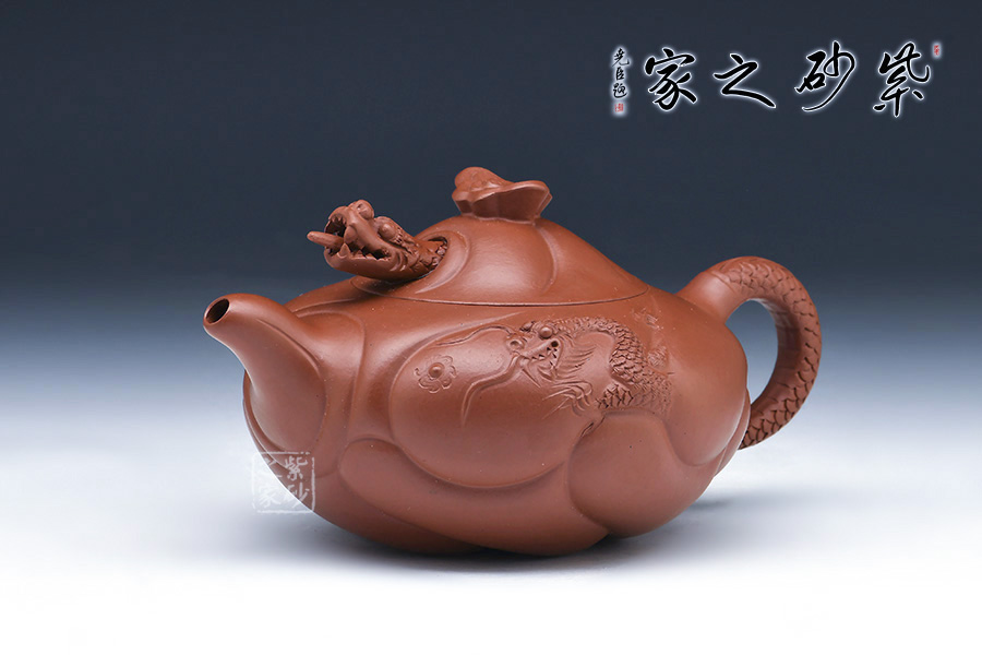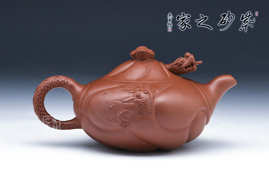 “魚(yú)化龍壺”為邵大亨原創(chuàng),以其寓意魚(yú)躍龍門(mén)而深受歡迎,為經(jīng)典的紫砂茗壺造型。