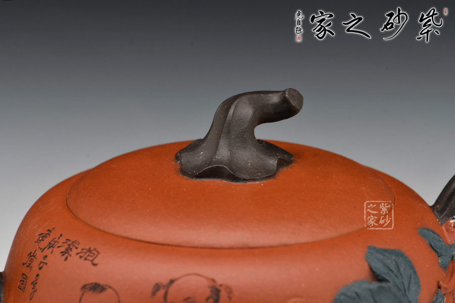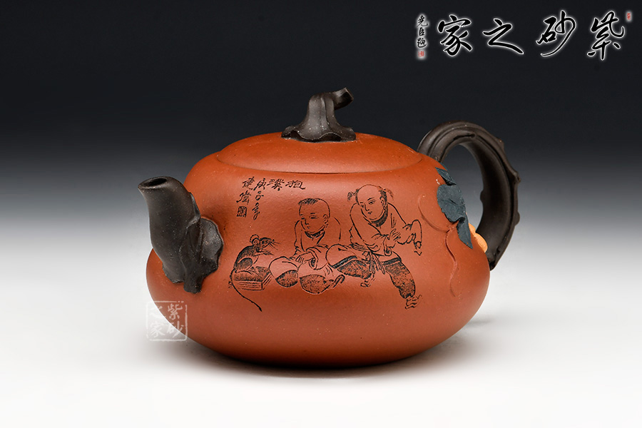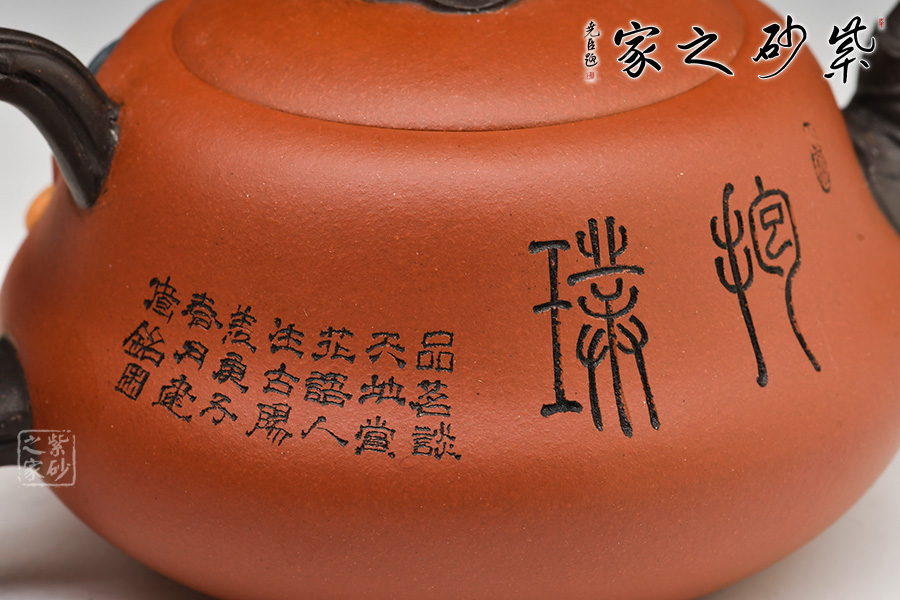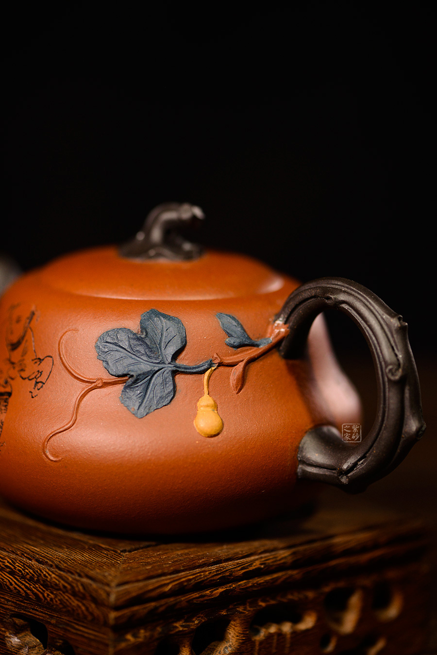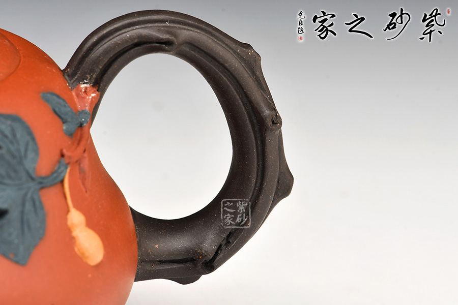 此壺整體型制簡單大方,實用方便,運用雙色泥技法,在細節(jié)處處理巧妙,體現(xiàn)在壺鈕、流、把,呈彎繞的枝節(jié)形態(tài),以及壺身上貼塑的黃果綠葉,亮眼但不突兀,自然和諧,體現(xiàn)”報樸“的主題。
