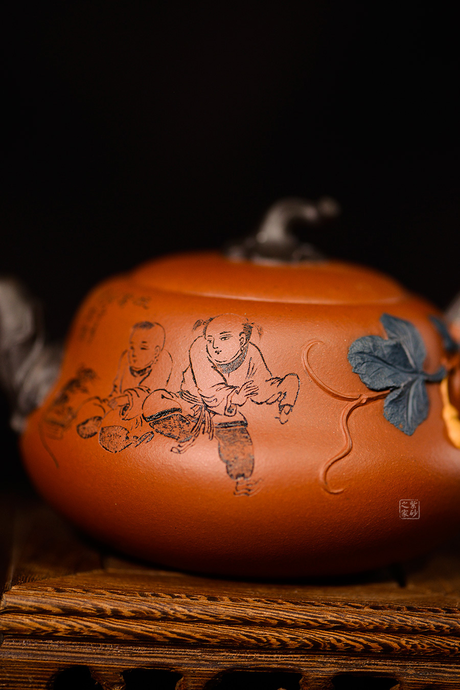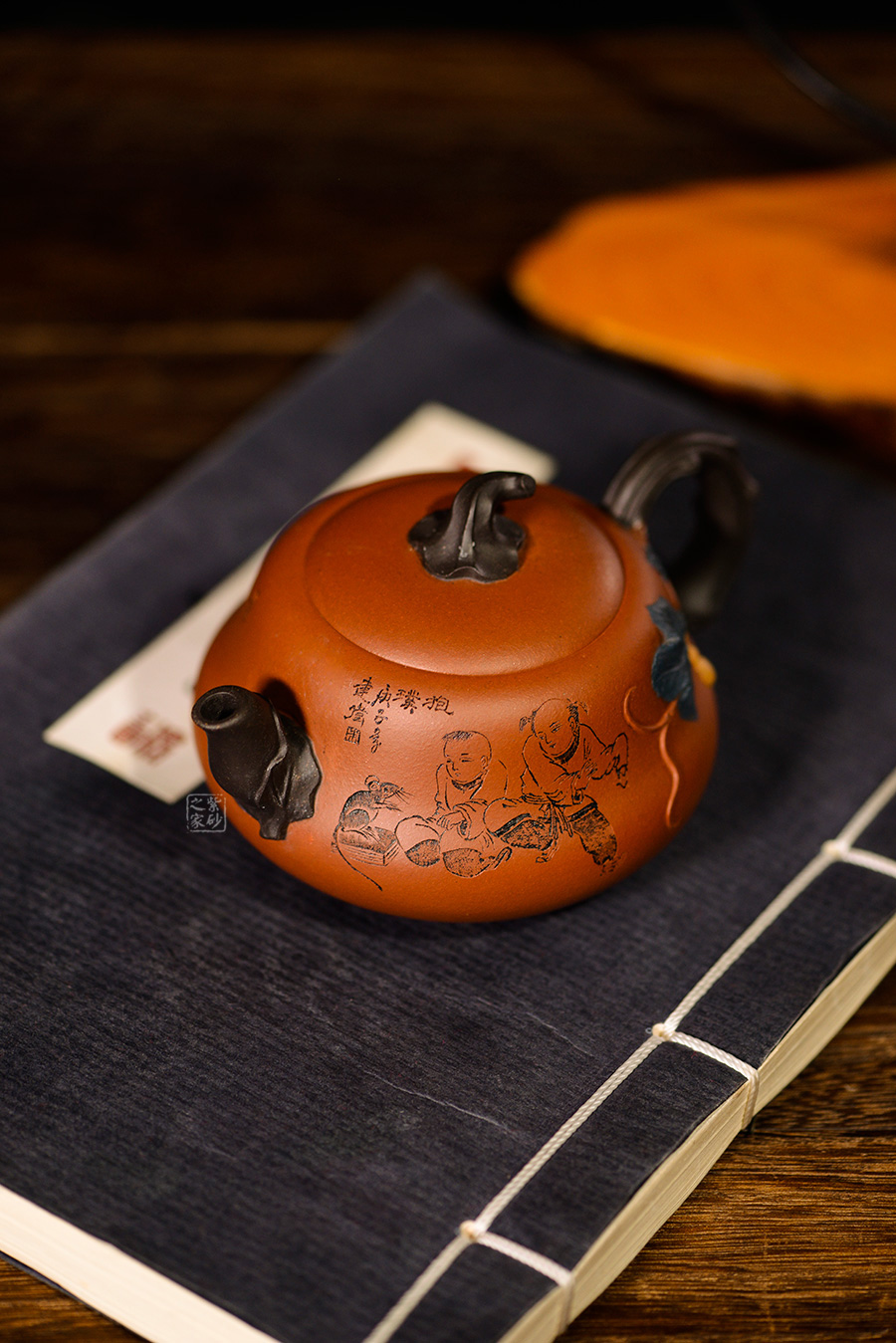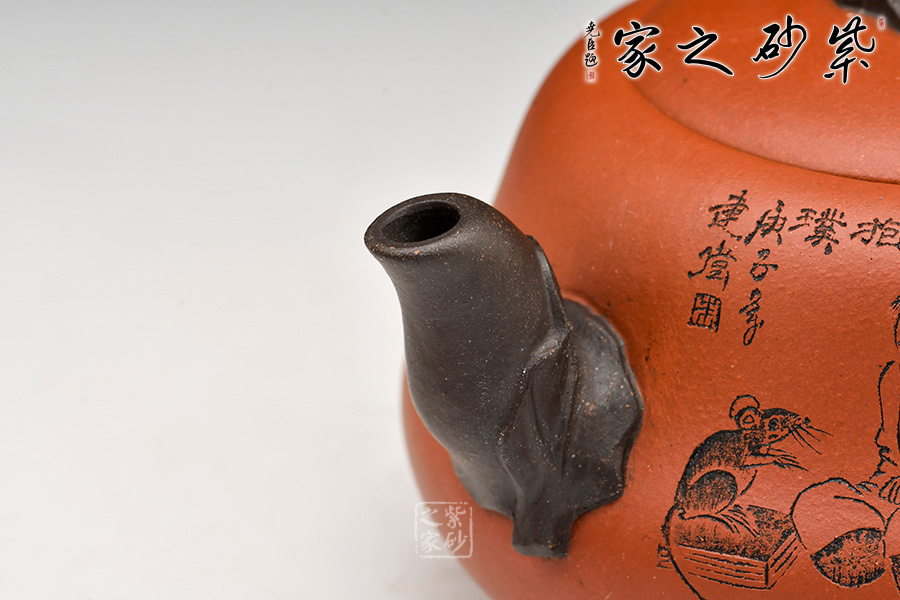 此壺整體型制簡單大方,實用方便,運用雙色泥技法,在細節(jié)處處理巧妙,體現(xiàn)在壺鈕、流、把,呈彎繞的枝節(jié)形態(tài),以及壺身上貼塑的黃果綠葉,亮眼但不突兀,自然和諧,體現(xiàn)”報樸“的主題。