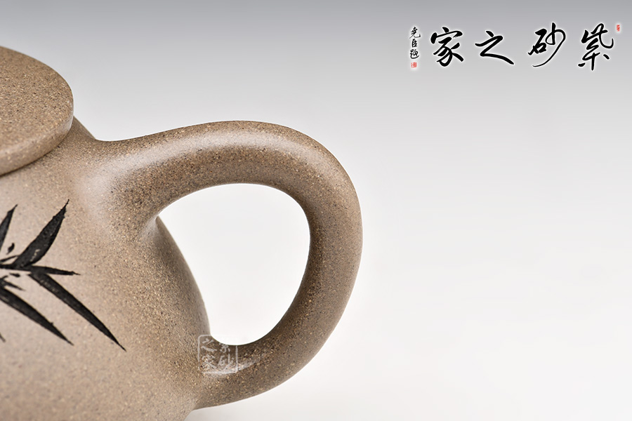 此款壺器型古拙,線面簡潔明快,還不失沉穩(wěn)大度。壺身仍沿襲古老方法上小下大,使重心下垂,使用起來更穩(wěn)當。壺嘴采用短而有力的直筒形,出水的力度更加佳,壺鈕如同一條拋物線連接壺蓋兩端,形如拱橋。