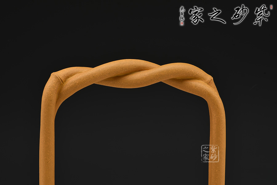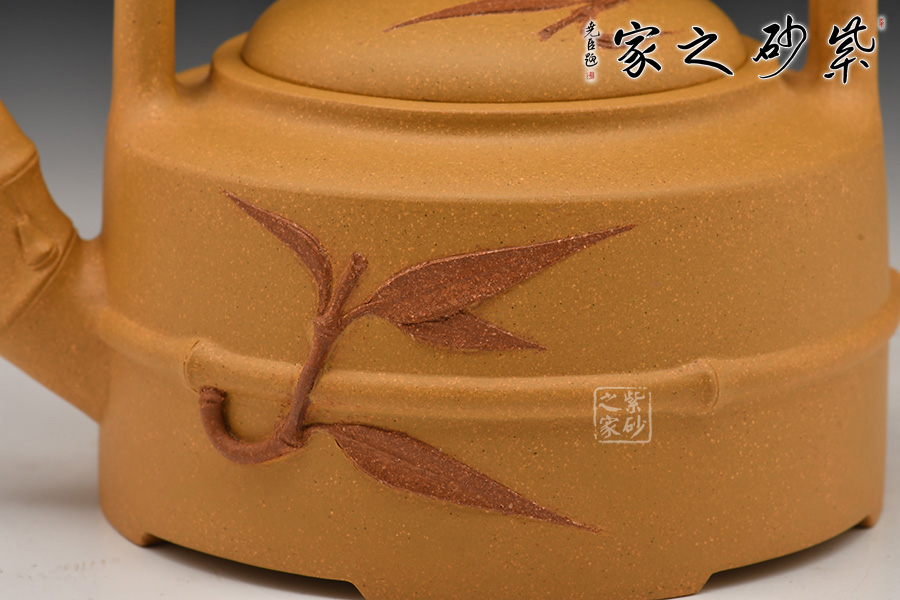 竹節(jié)提梁壺造型經(jīng)典而大氣,壺身比例分配得當,做工老到而精細。壺體呈圓柱形且勻稱,用料及其考究,采用原礦黃金段泥制作而成,金黃的顏色似有一種王者之氣。壺的提梁設(shè)計非常特別,中間部分竹節(jié)交纏,過渡和緩。還有竹節(jié)嘴、竹枝鈕,壺身竹葉貼花,整體渾然一體,布局緊致而有度,構(gòu)思合理。