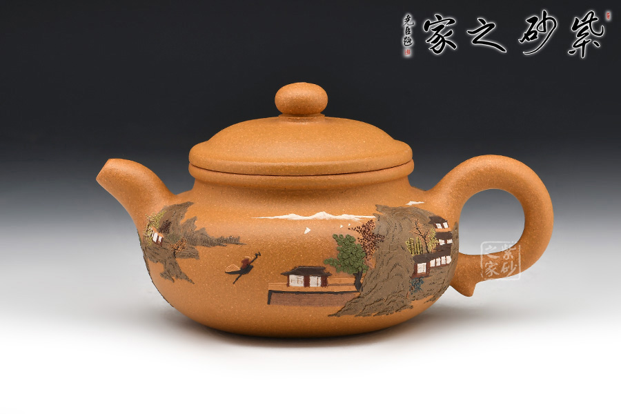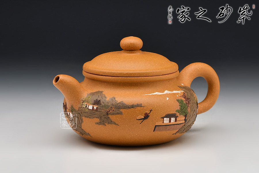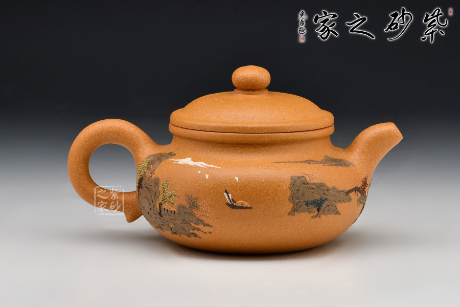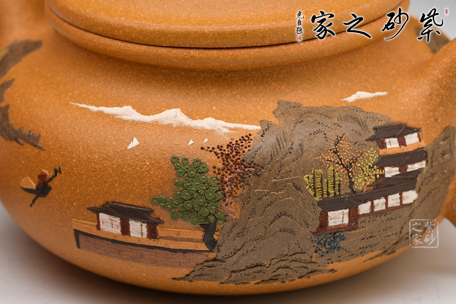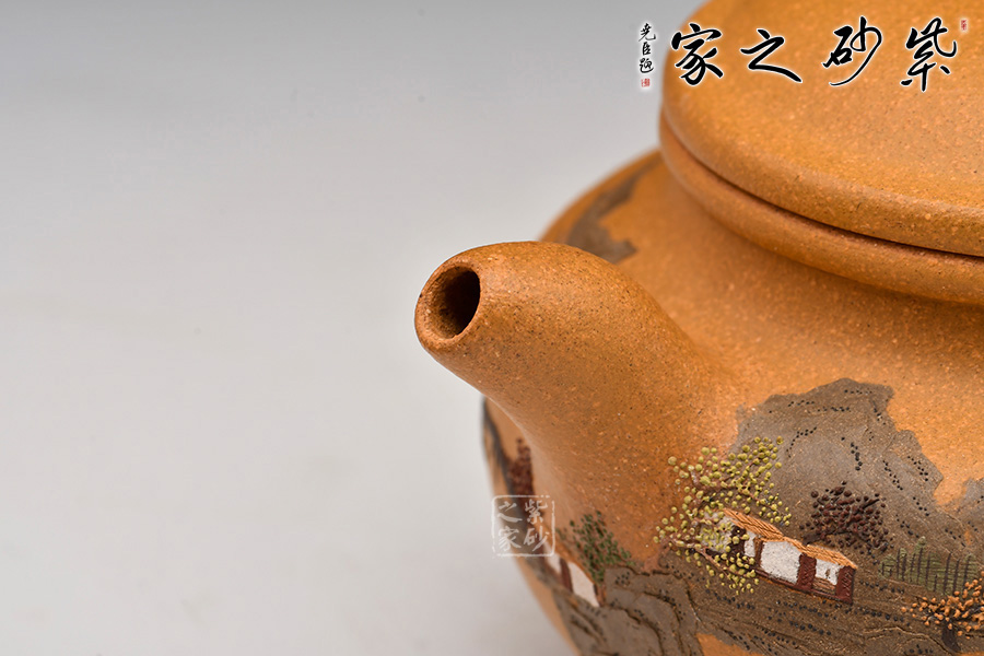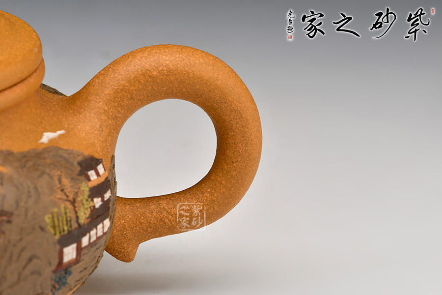 壺體細繪山水書畫,通過不同的筆墨、色彩來展現(xiàn)山水,筆法細膩,惟妙惟肖,山水布局精妙,泥繪用色濃淡相宜,讓人如臨詩詞古人之境。