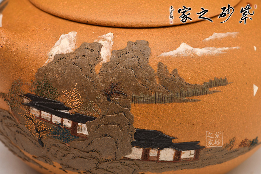 壺體細繪山水書畫,通過不同的筆墨、色彩來展現(xiàn)山水,筆法細膩,惟妙惟肖,山水布局精妙,泥繪用色濃淡相宜,讓人如臨詩詞古人之境。