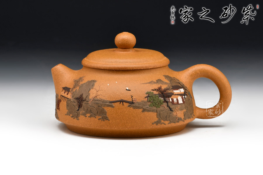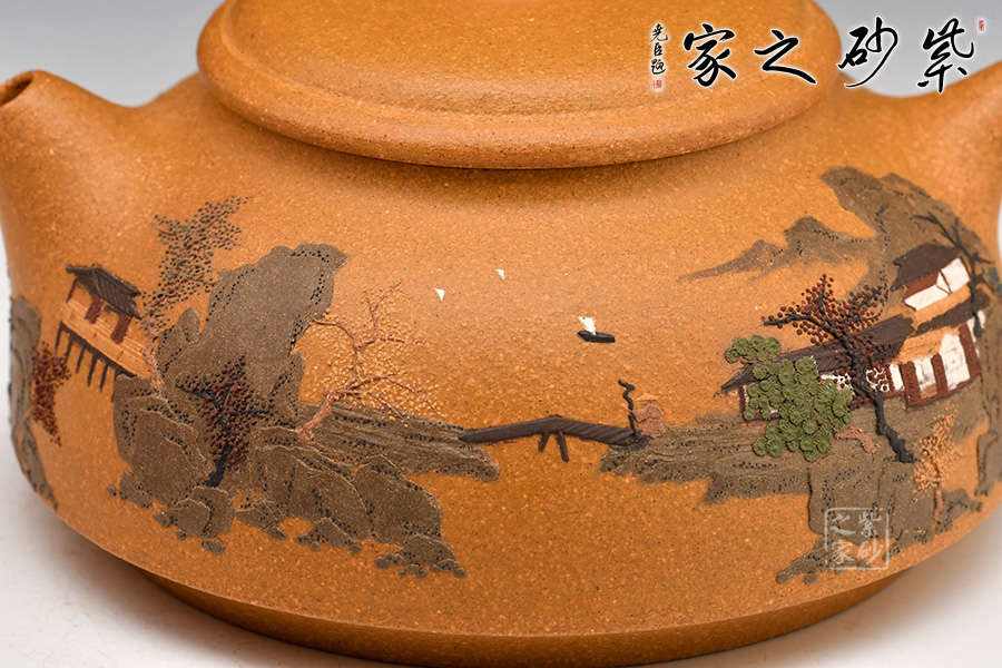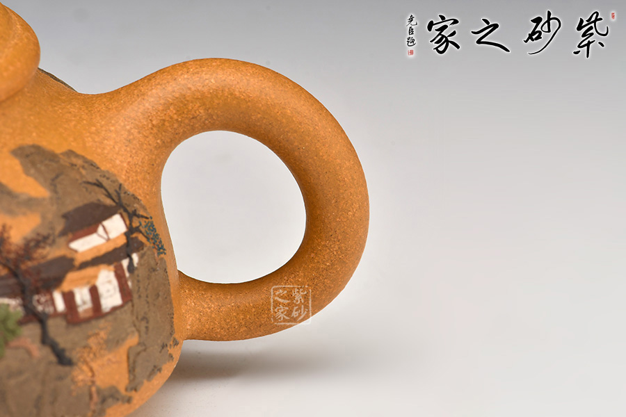 壺體細(xì)繪山水書畫,通過不同的筆墨、色彩來展現(xiàn)山水,筆法細(xì)膩,惟妙惟肖,山水布局精妙,泥繪用色濃淡相宜,讓人如臨詩詞古人之境。