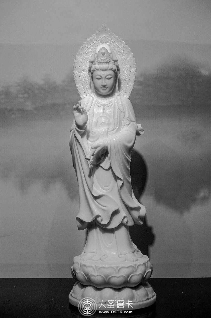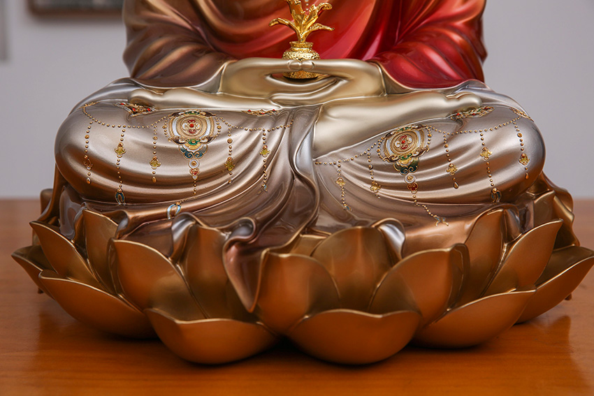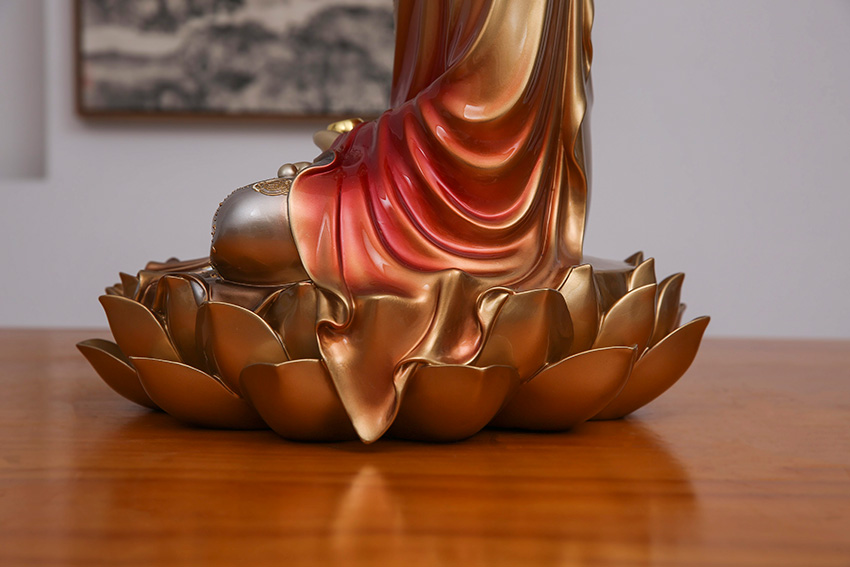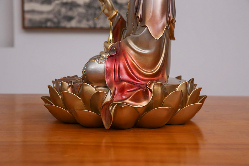 此尊觀音菩薩高度為48公分,采用純銅灼彩工藝,再經(jīng)多道工序制作而成。