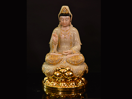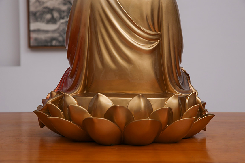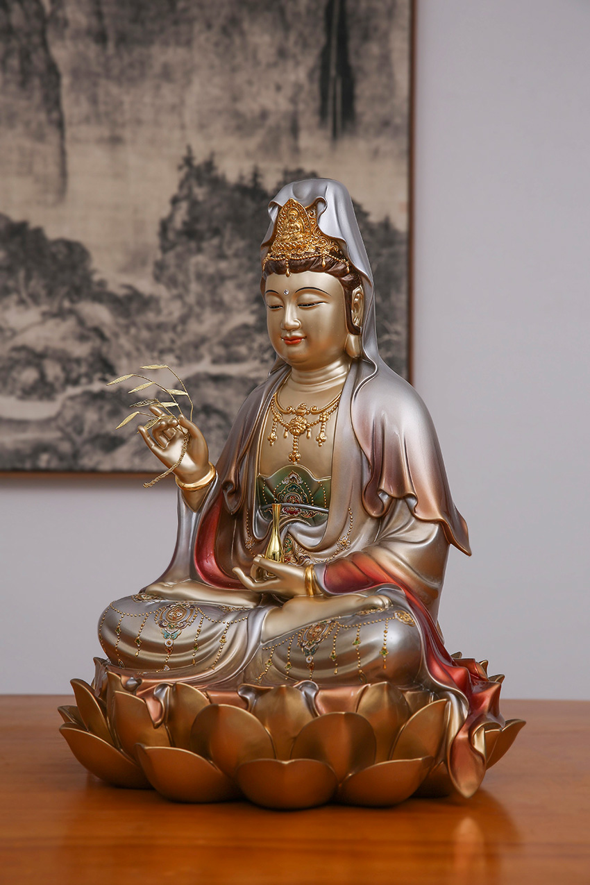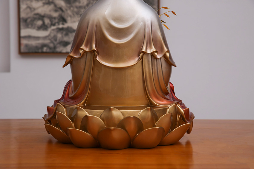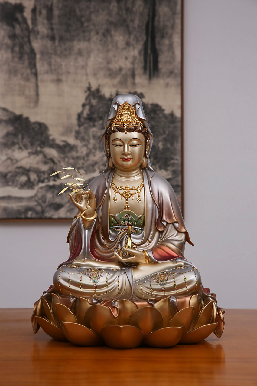 此尊觀音菩薩高度為48公分,采用純銅灼彩工藝,再經(jīng)多道工序制作而成。