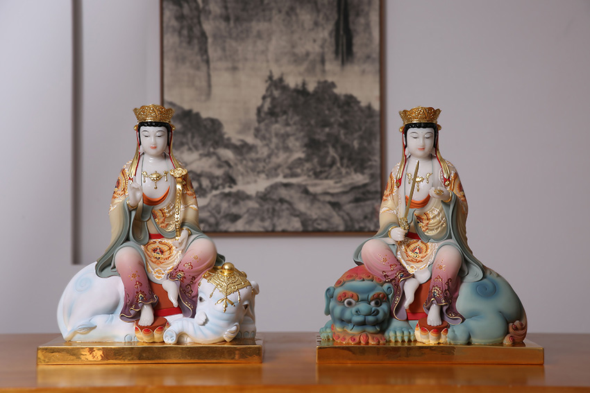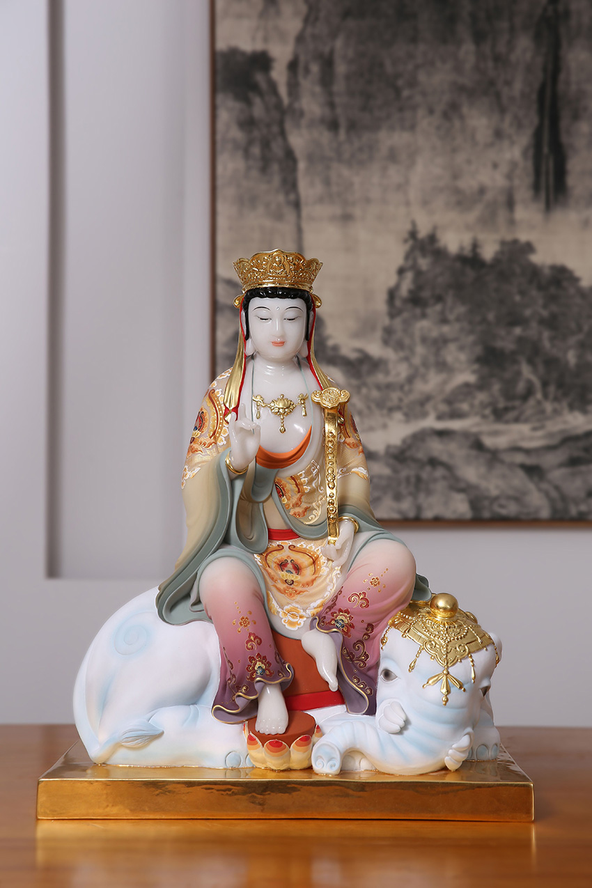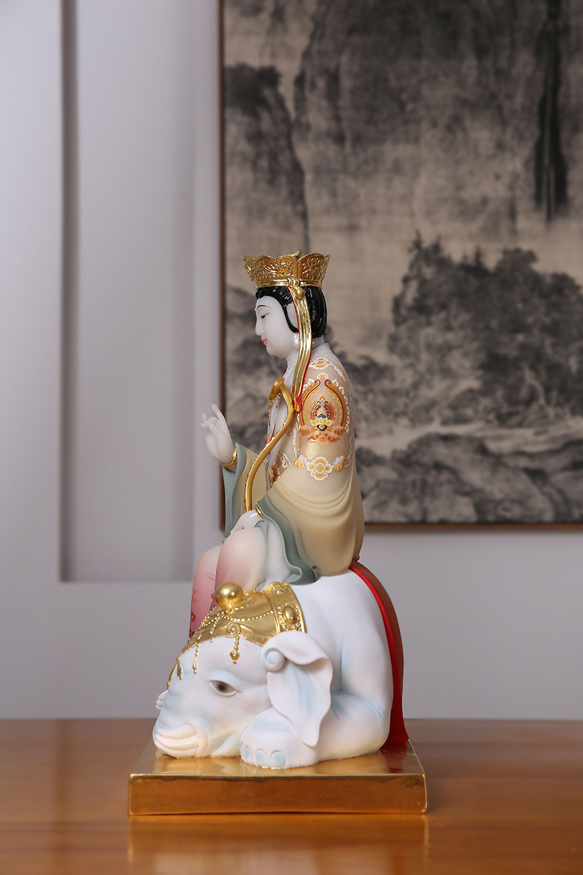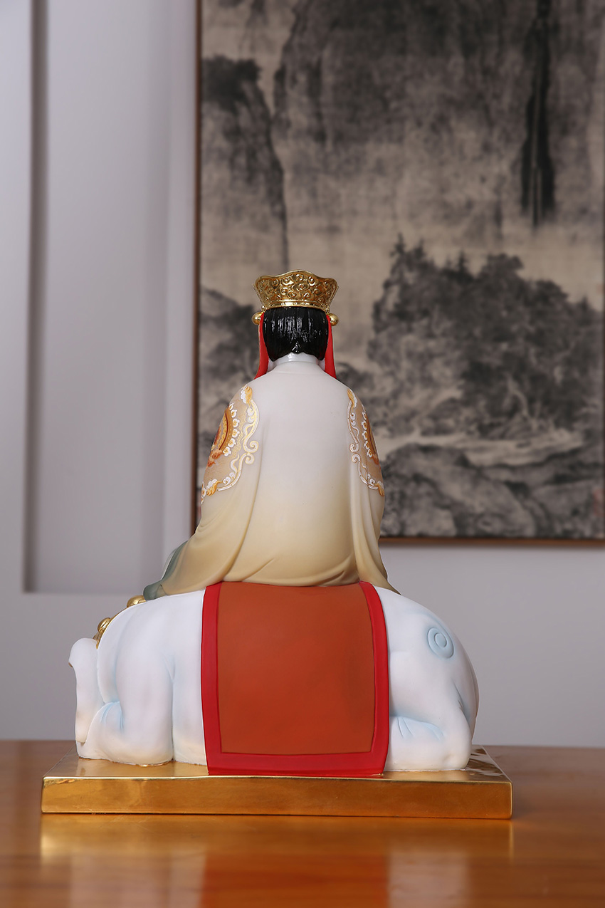 手持如意棒,象征如意,事事通達(dá);坐于六牙白象之上,面目慈悲,垂憐眾生。
