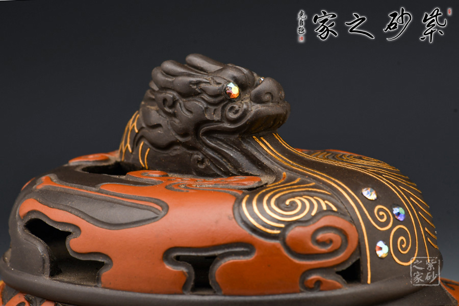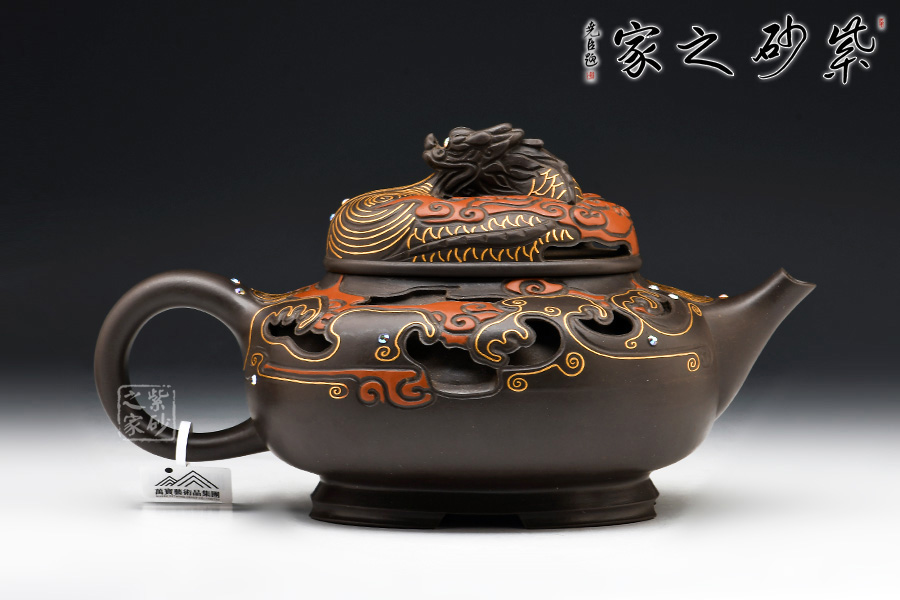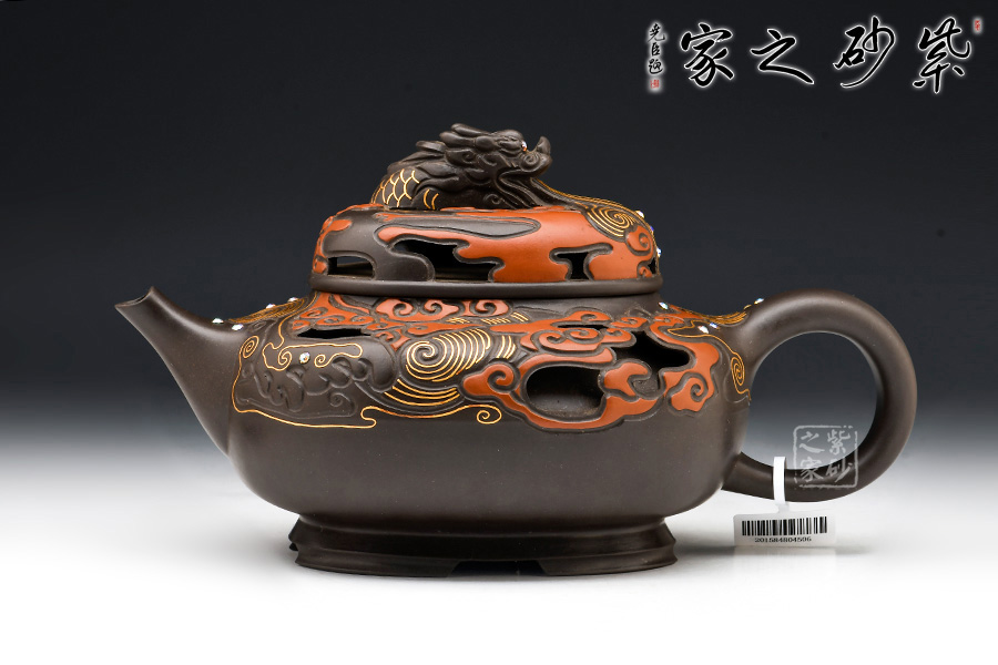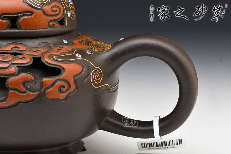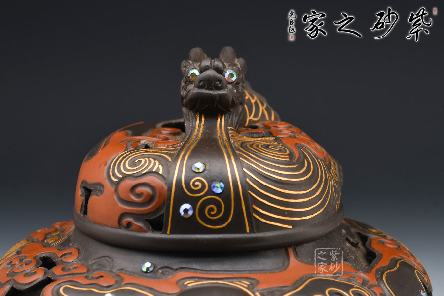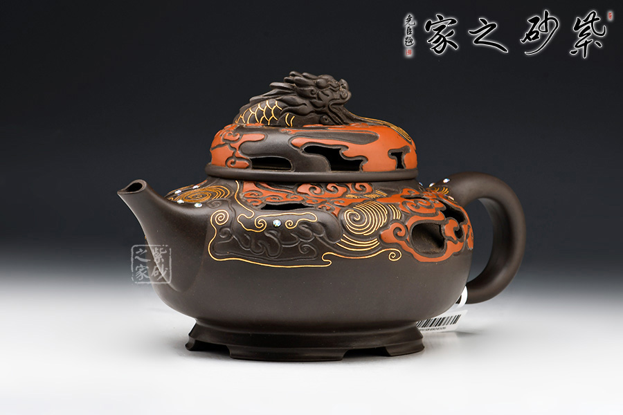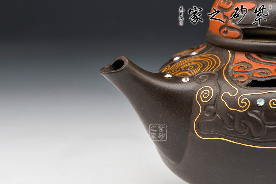 將金、銀絲(片)鑲嵌于紫砂器上,采用雕、鏤、刻、塑、堆、填等多種手法,或再施以珠寶玉石等材質,賦茗壺以異彩奇珍,別具一格,在樸質典雅中求得華貴端莊的氣韻。