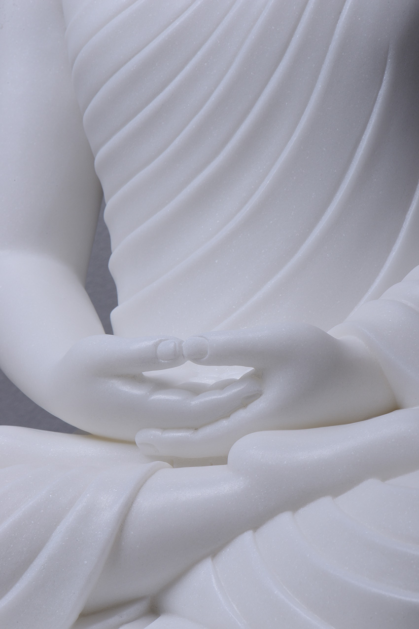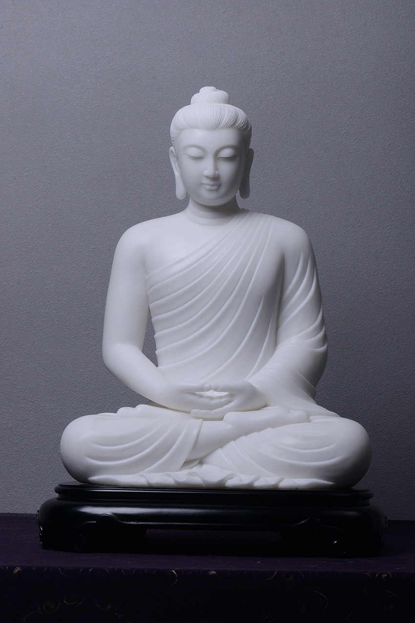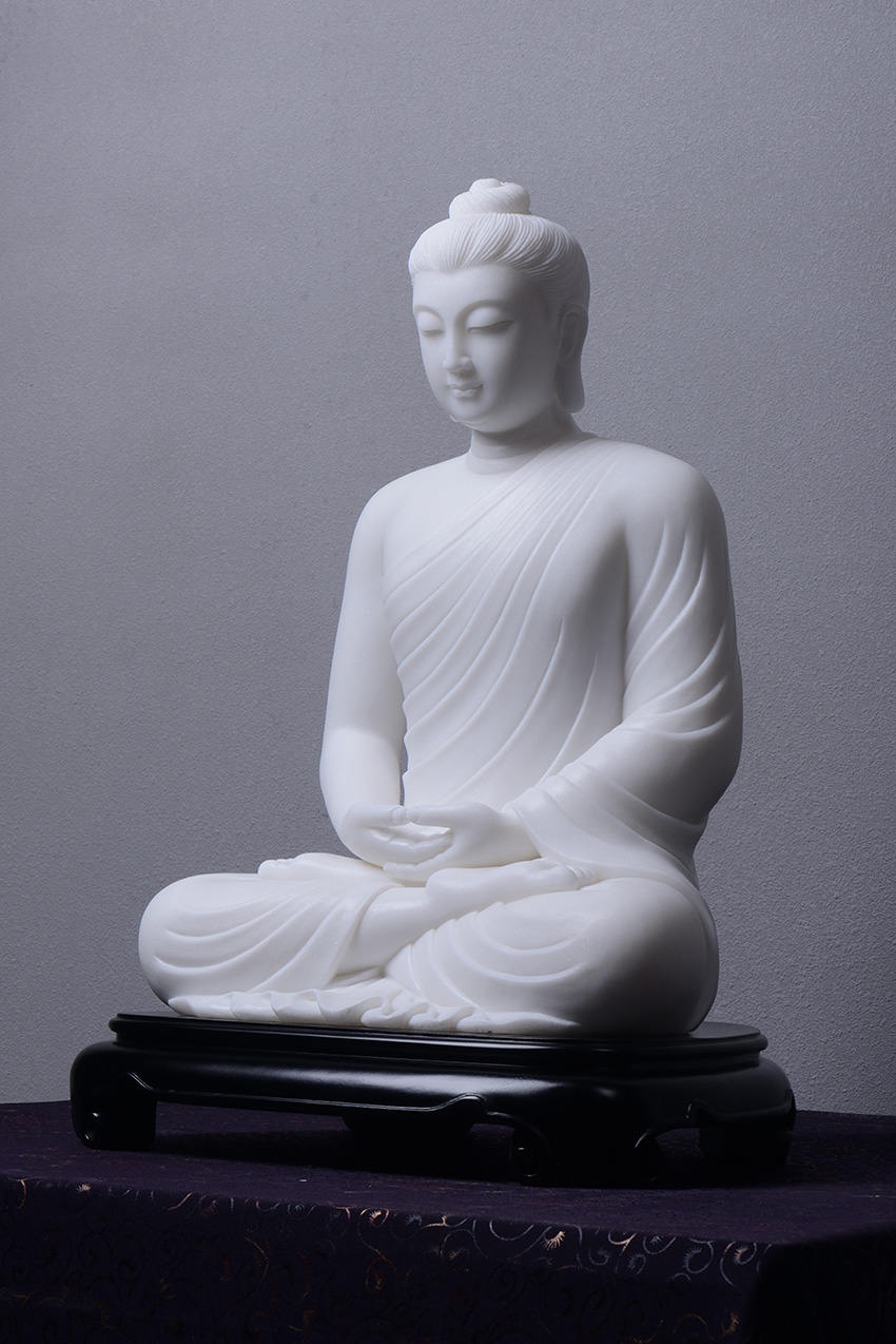 佛像材質(zhì)為漢白玉,通體潔白無(wú)瑕,內(nèi)含閃光晶體,晶瑩剔透,熠熠生輝,是一種具有觀賞性的建筑和雕刻材料。