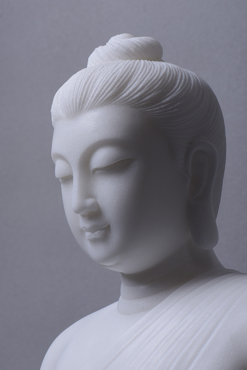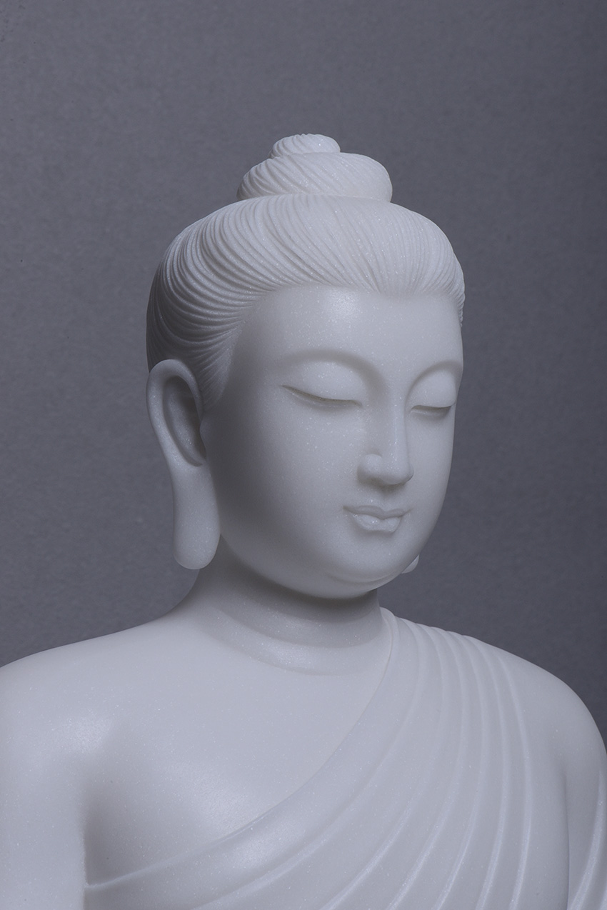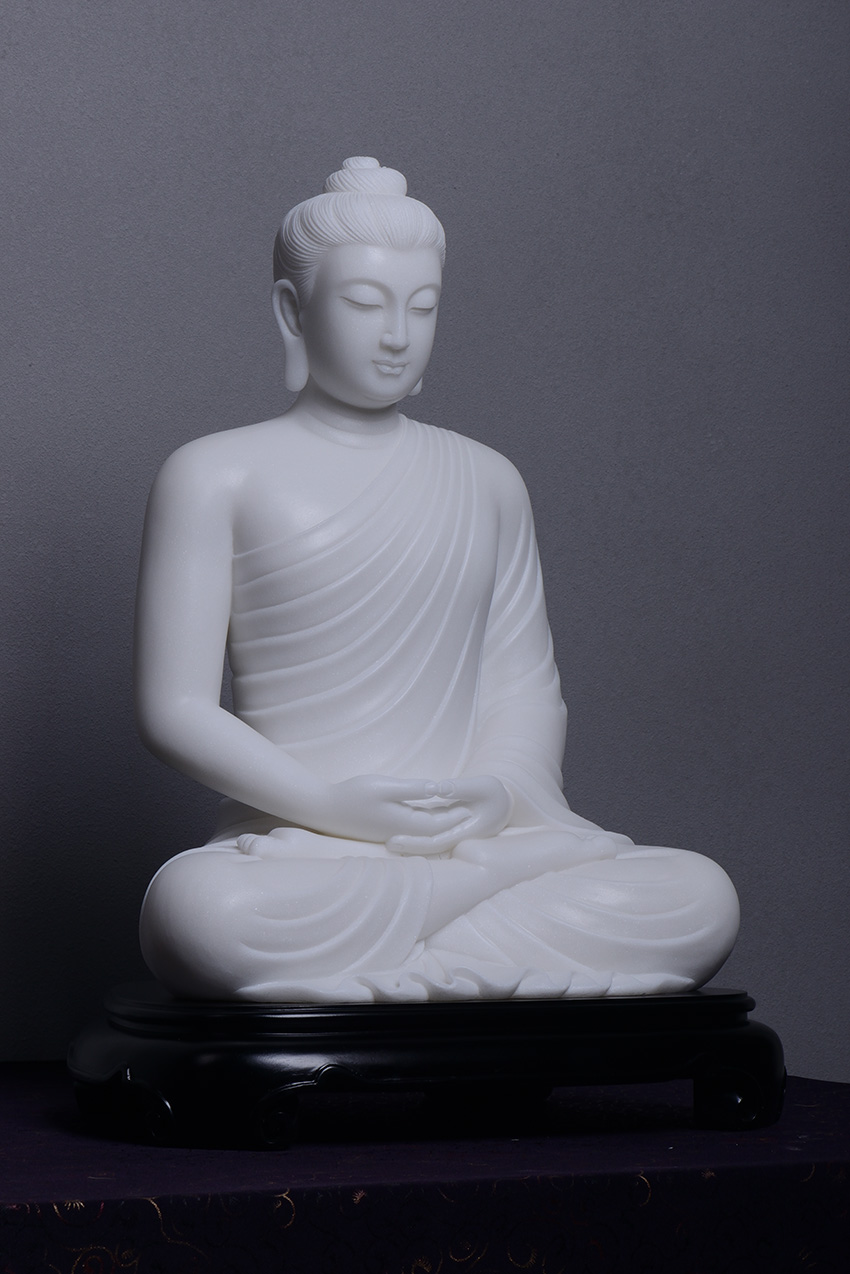 佛像材質(zhì)為漢白玉,通體潔白無(wú)瑕,內(nèi)含閃光晶體,晶瑩剔透,熠熠生輝,是一種具有觀賞性的建筑和雕刻材料。