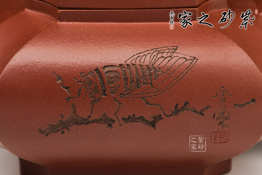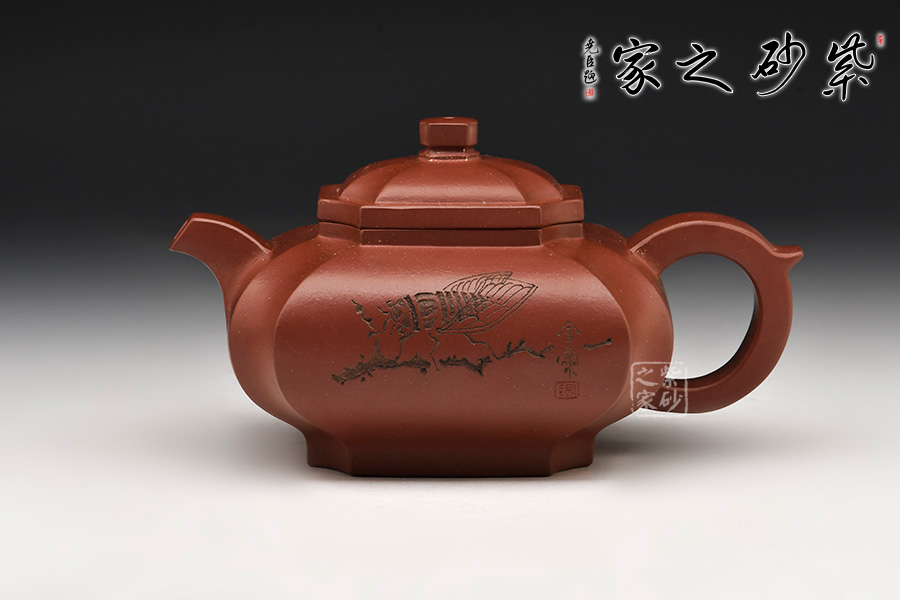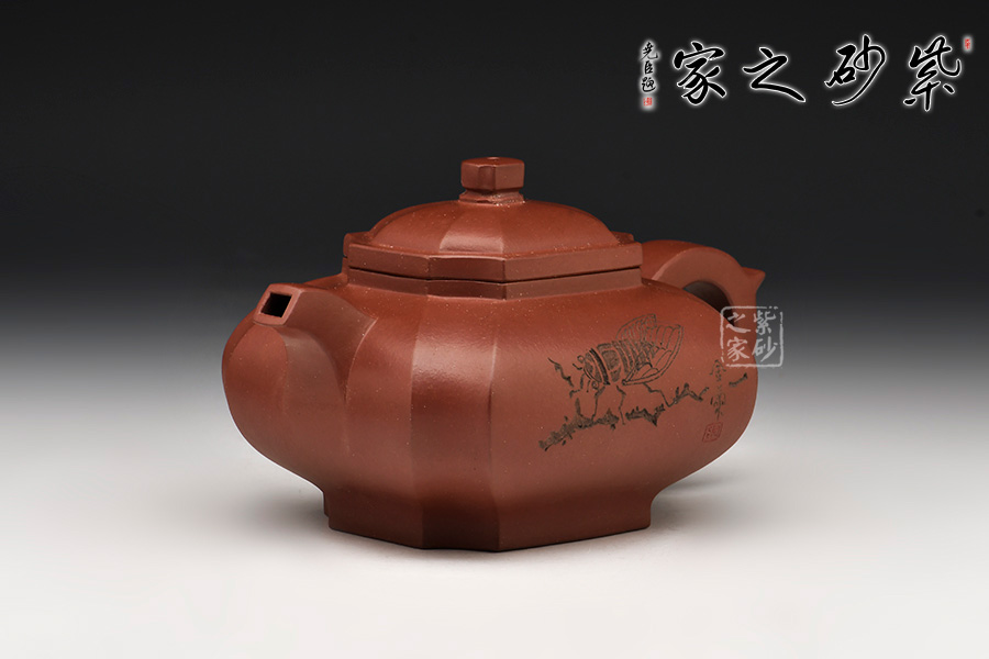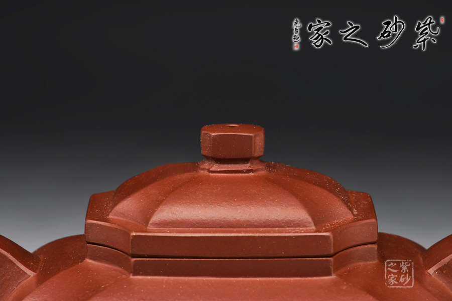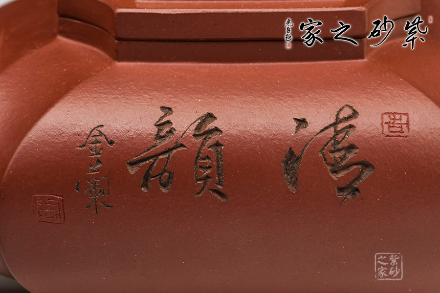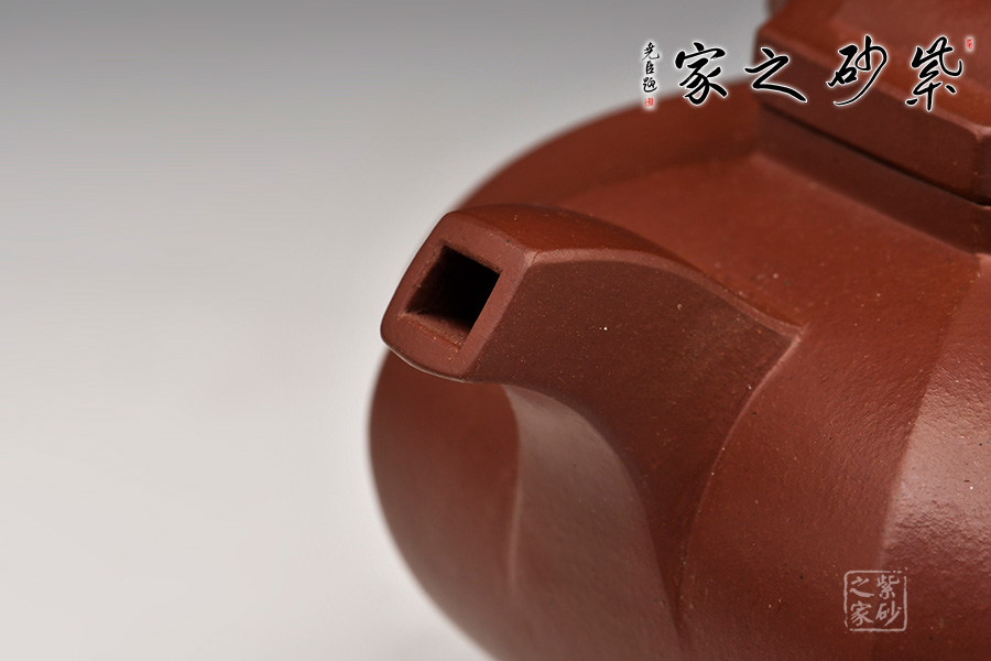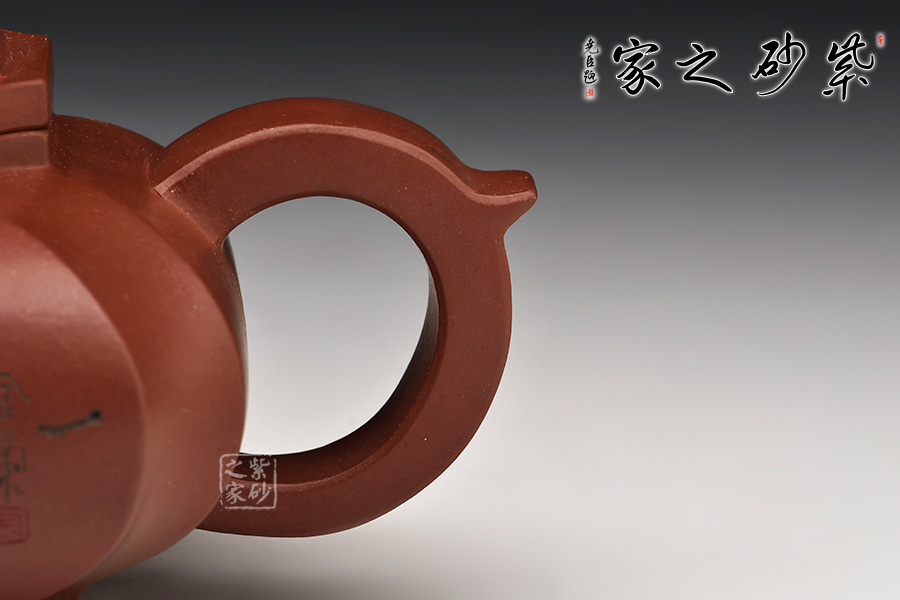 此壺泥色呈紫栗,四方壺身,方中寓圓,四周凹線,動(dòng)暢十足。柱型鈕極具力道,為點(diǎn)睛之筆,使全壺靈巧生動(dòng)。