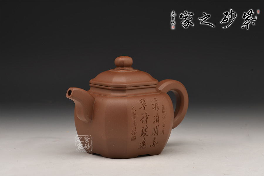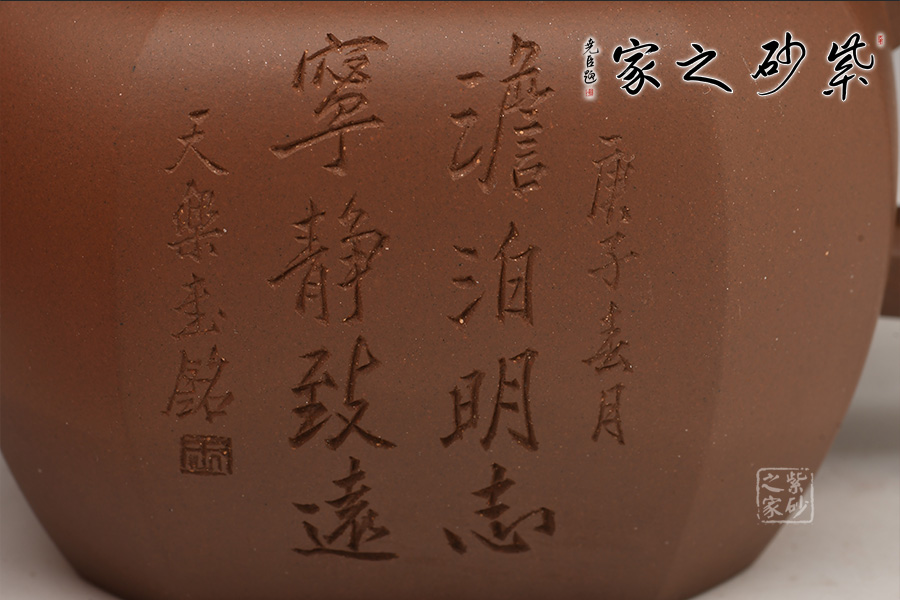 光貨離不開裝飾。俗話說“壺隨字貴,字隨壺傳”:光壺不刻字,就是一把光壺;壺上面刻了大師、名人的字,一把壺的含金量就高了,收藏價值就更高,升值潛力就更大。王福君與中國工藝美術大師譚泉海合作最多,其次是徐安碧、鮑志強、毛國強(均為中國工藝美術大師、中國陶瓷藝術大師)。