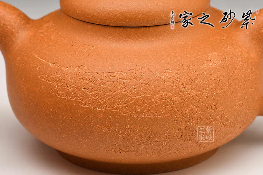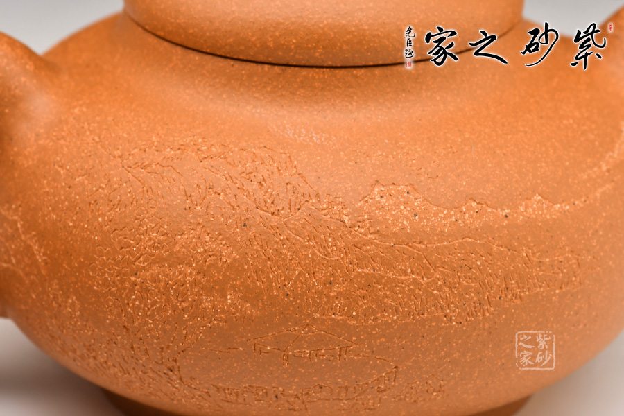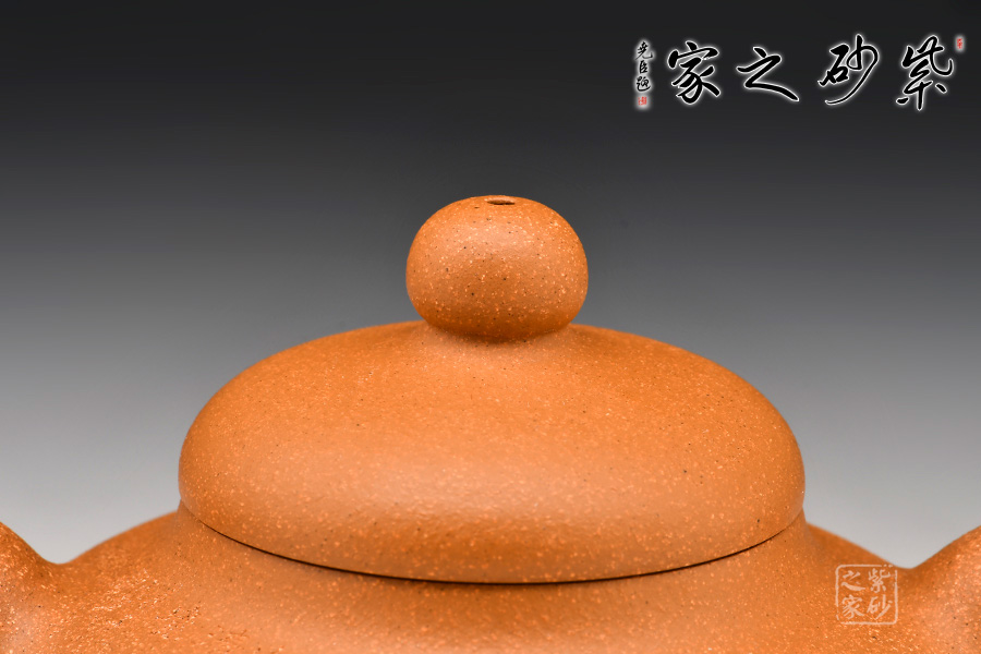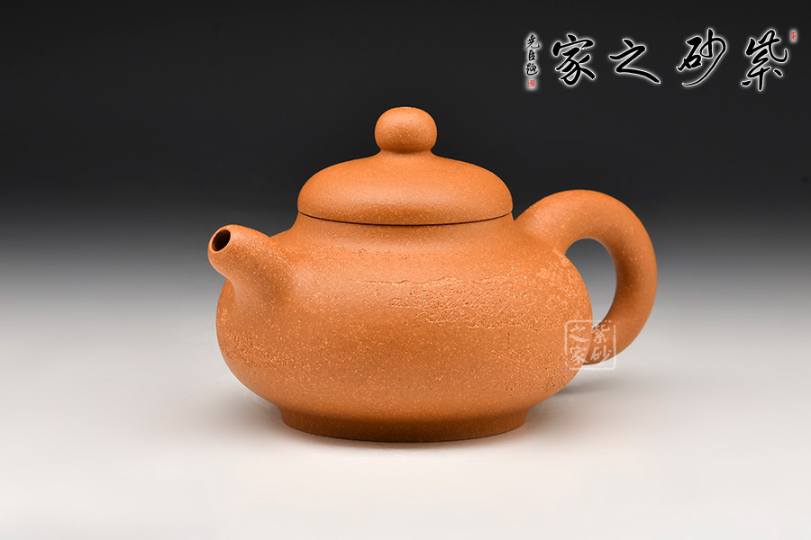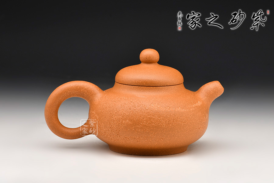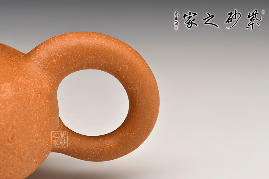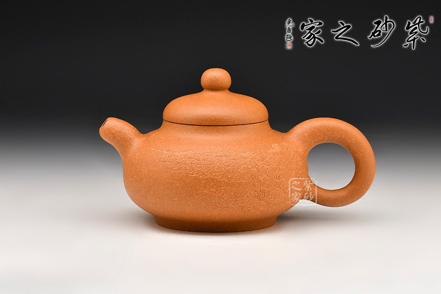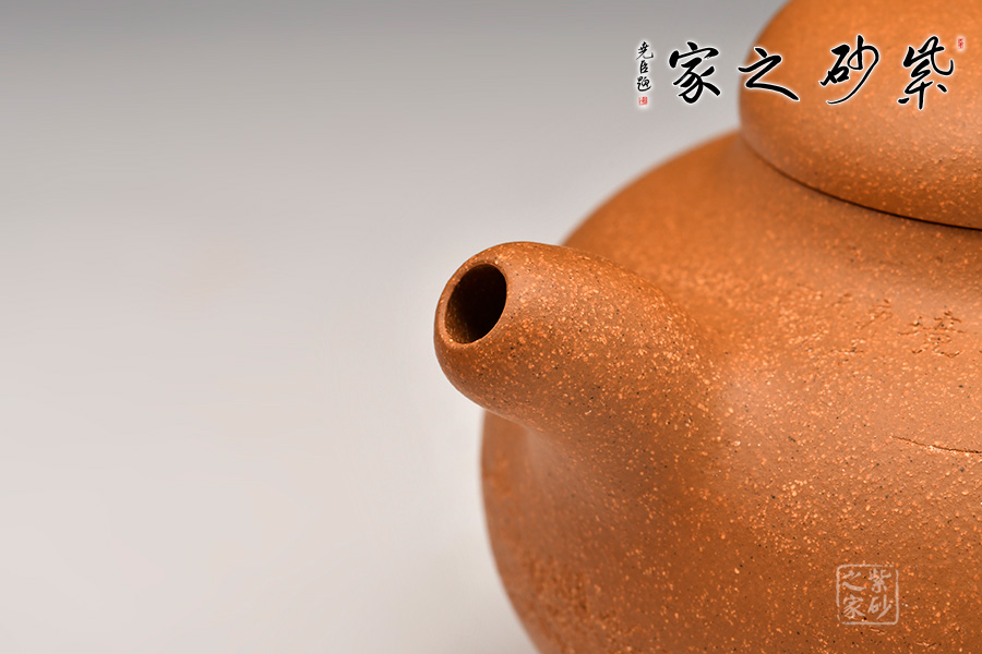 壺身為扁圓球型,線條飽滿,輪廓柔和。壺底加圈足,和壺頸部上下對應,優(yōu)雅氣韻由此頓生。蓋面飽滿圓潤,與整壺猶如一體,蓋上圓珠壺鈕圓滑可愛,精妙可人。壺把和壺嘴的線條非常明朗,與壺身相比似有些過于清晰,但正是因此,此壺特別的味道才更加濃厚。