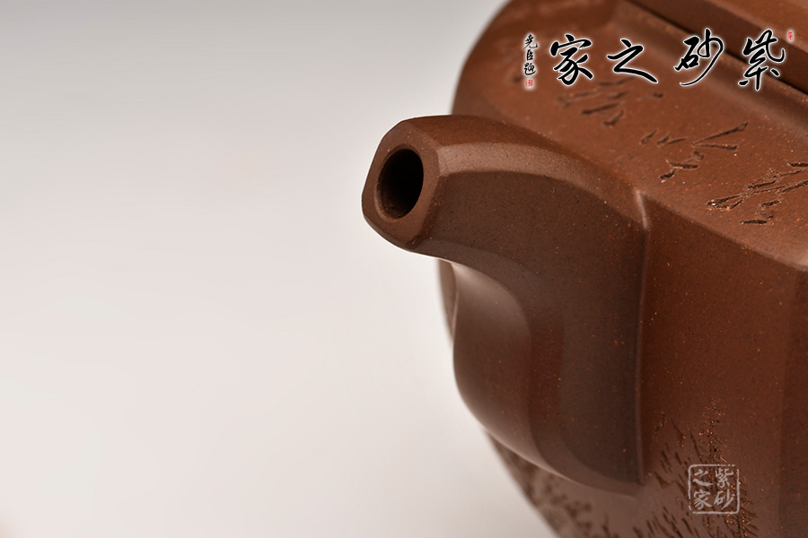 這把福和八方壺,爽凈精當(dāng),通體以“八”意呈現(xiàn)。壺鈕為扁八方,壺流、壺把也均為方形展現(xiàn),線條挺拔過渡自然,與壺體線條互相呼應(yīng),流暢美觀。壺形雄偉剛正,在八方之中透以圓意,使人觀之有成熟大氣、方正不阿之感,充滿對(duì)未來的憧憬與希望。