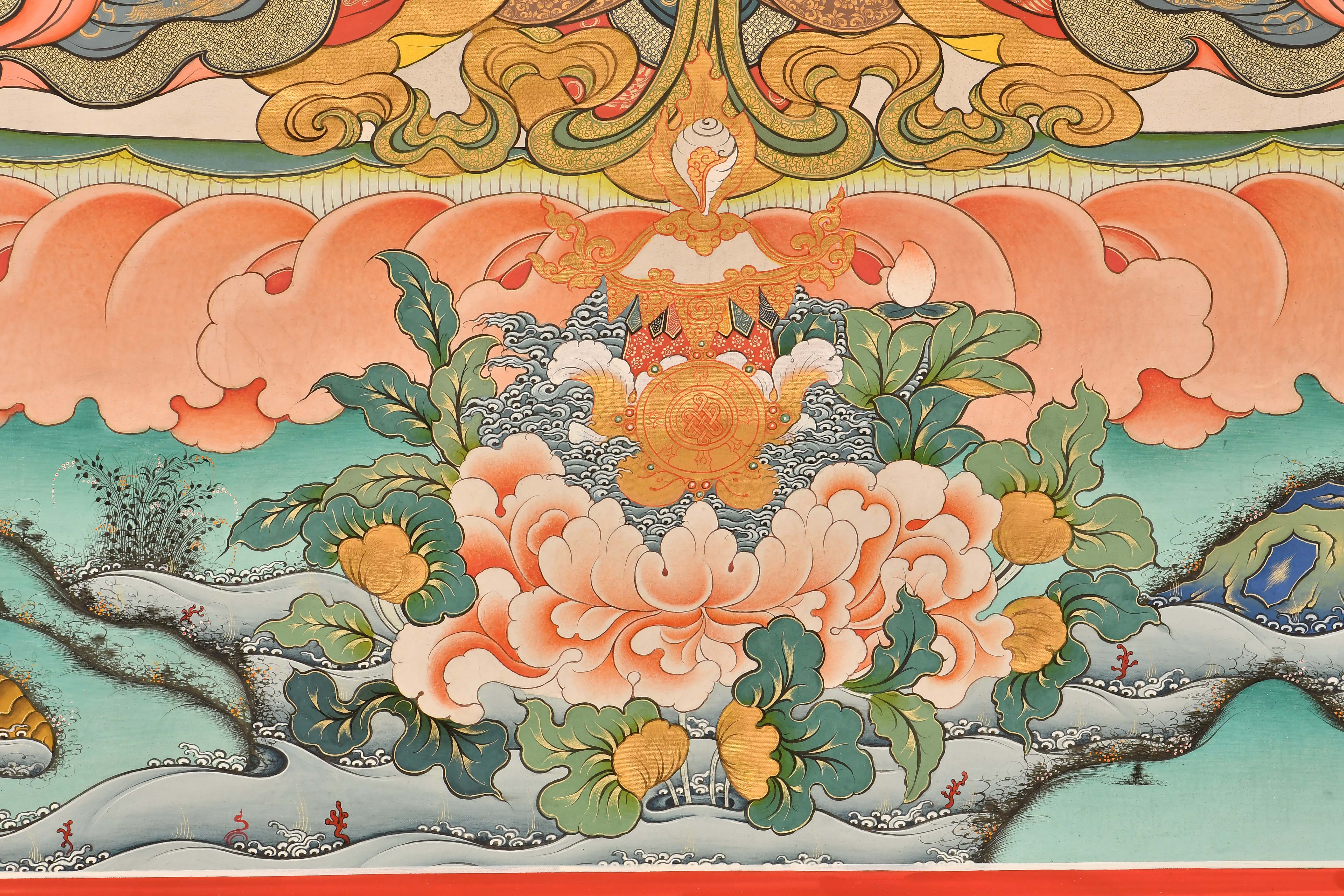此幅唐卡為青海熱貢唐卡,吾屯下寺出家?guī)煾讣獯氪髱熇L制,色彩鮮艷明亮,畫工精致細膩。