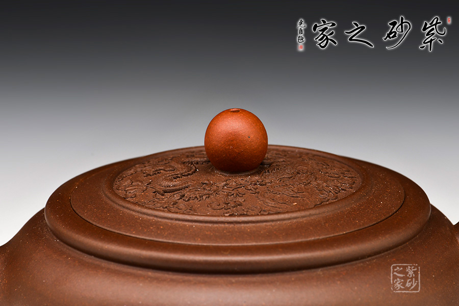 以龍鳳為題材,壺身圓潤(rùn)飽滿,圈足作底,紅寶珠形鈕,更增古韻。蓋面飾“龍鳳飛天”之勢(shì),形態(tài)美好而又銜接自然,藝術(shù)美感氣息濃厚。