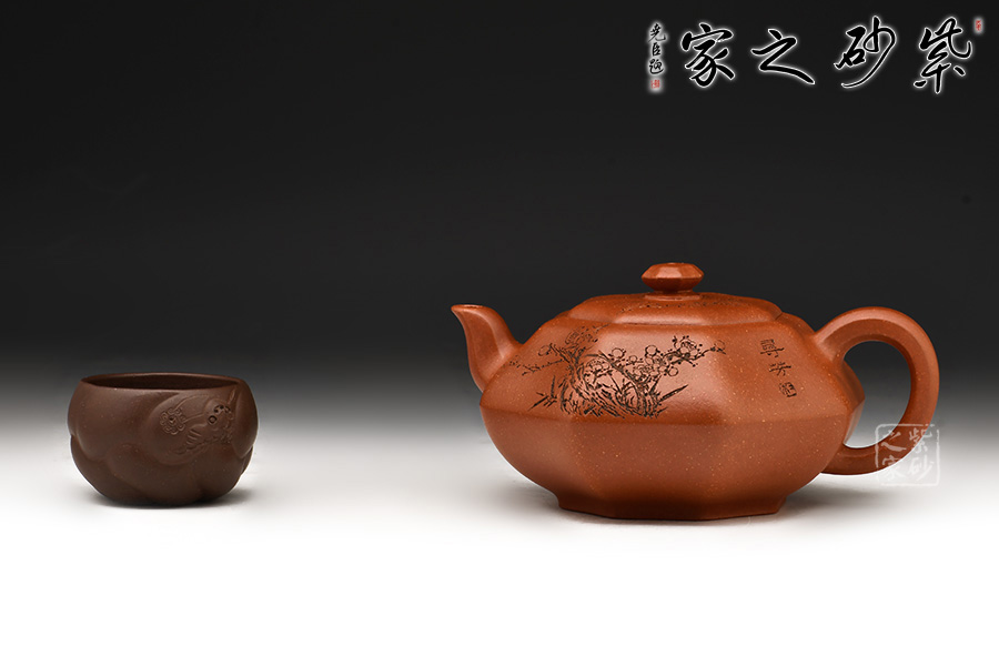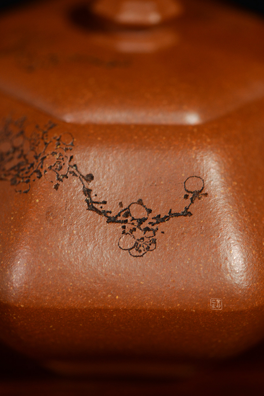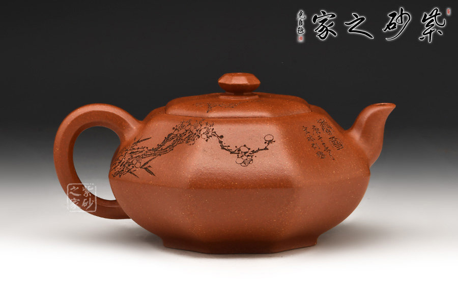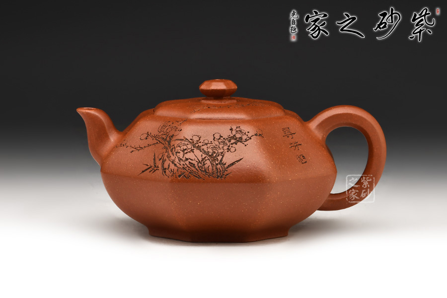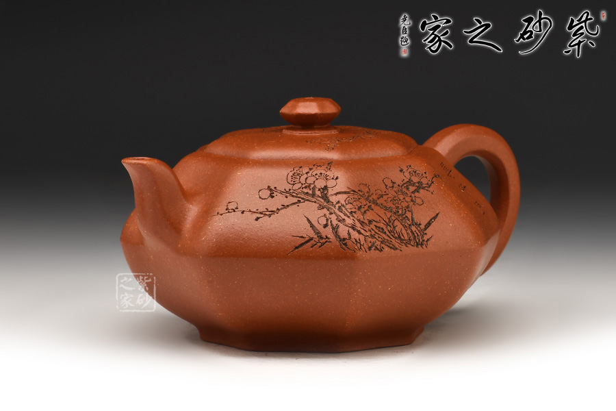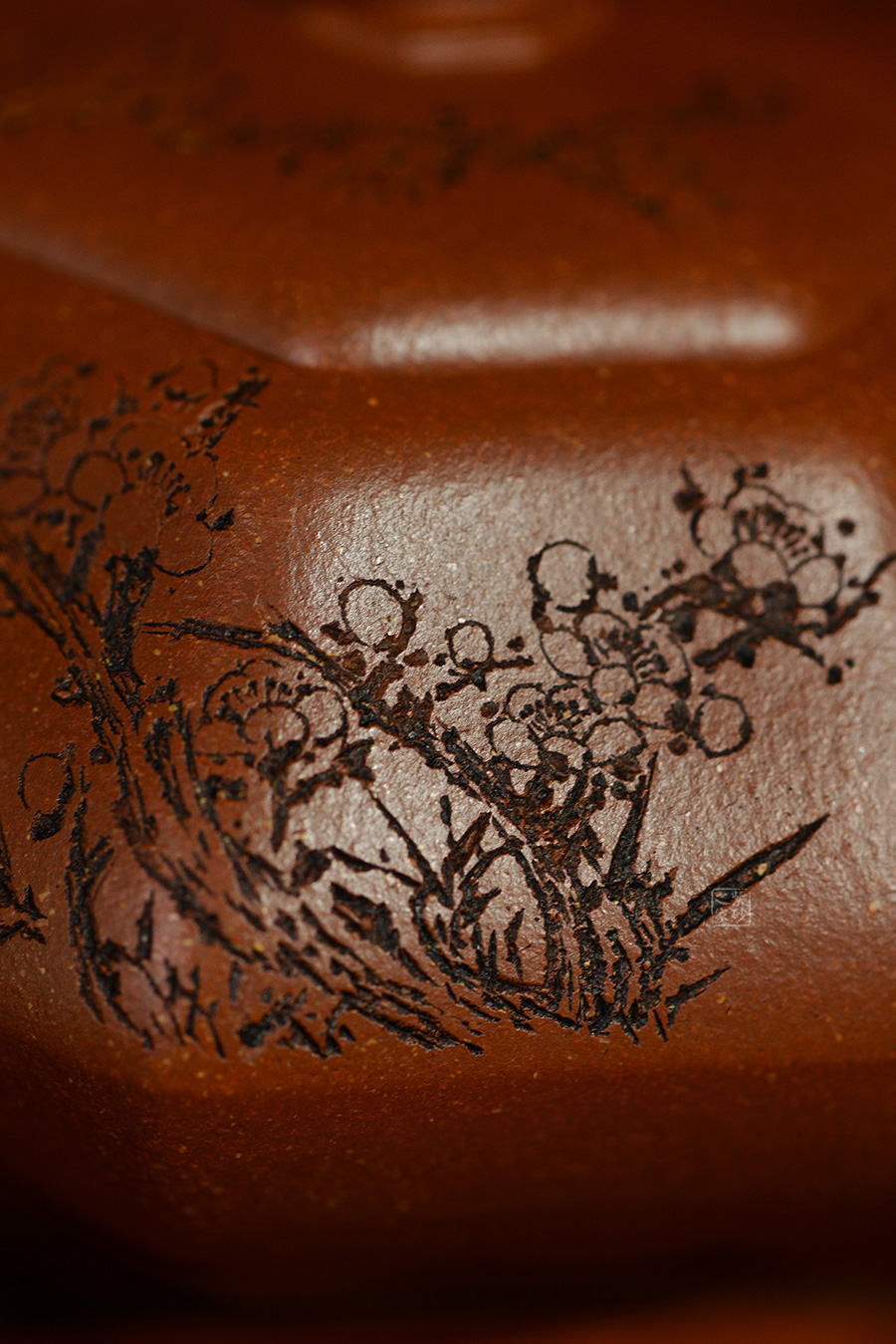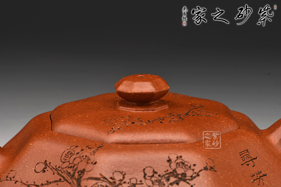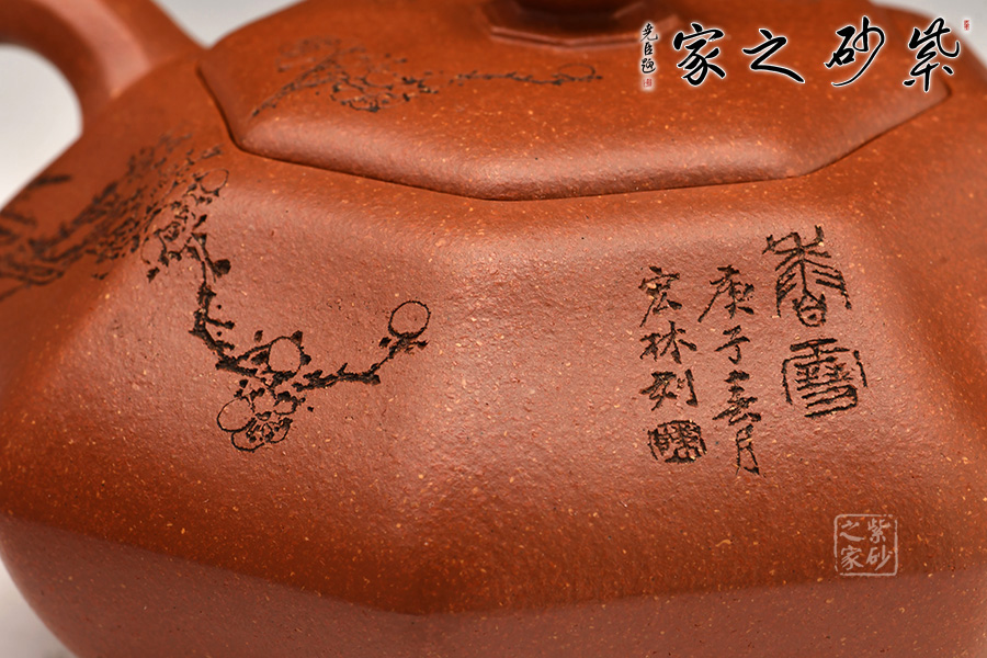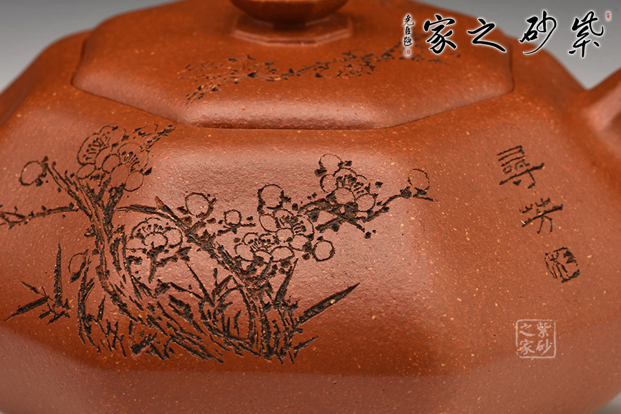 加之陶刻大家陳宏林裝飾刻繪梅花,一是風(fēng)骨,二是配合優(yōu)質(zhì)降坡泥所呈現(xiàn)出來的年代感,刻繪梅花效果更佳,更因?yàn)檫@把壺俯視看狀若梅花,整體可謂脫俗樸雅,儀態(tài)紛呈,大雅而深意無窮。