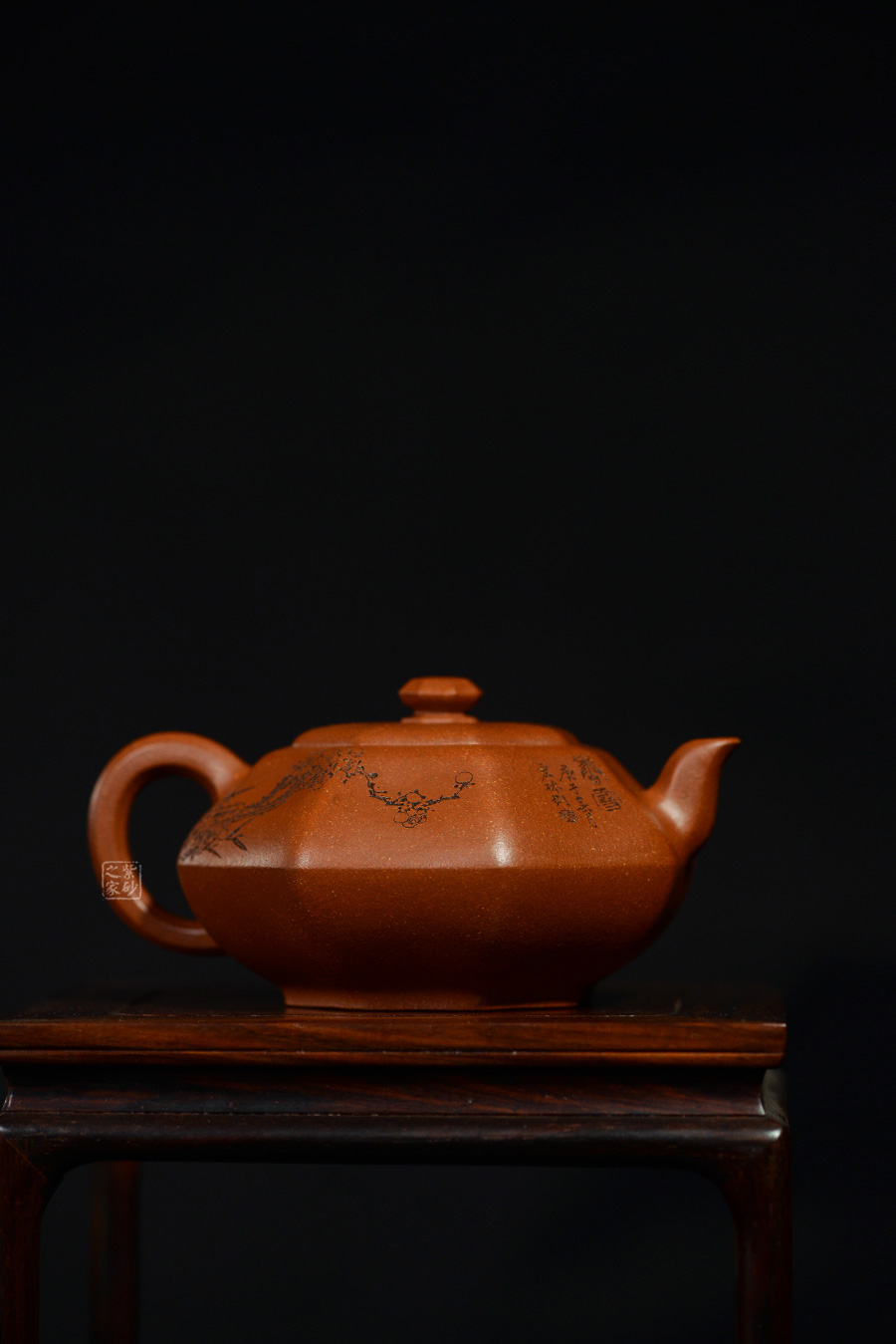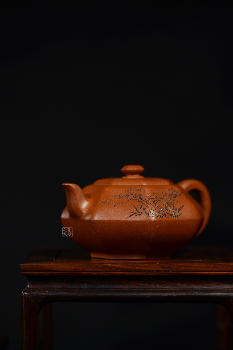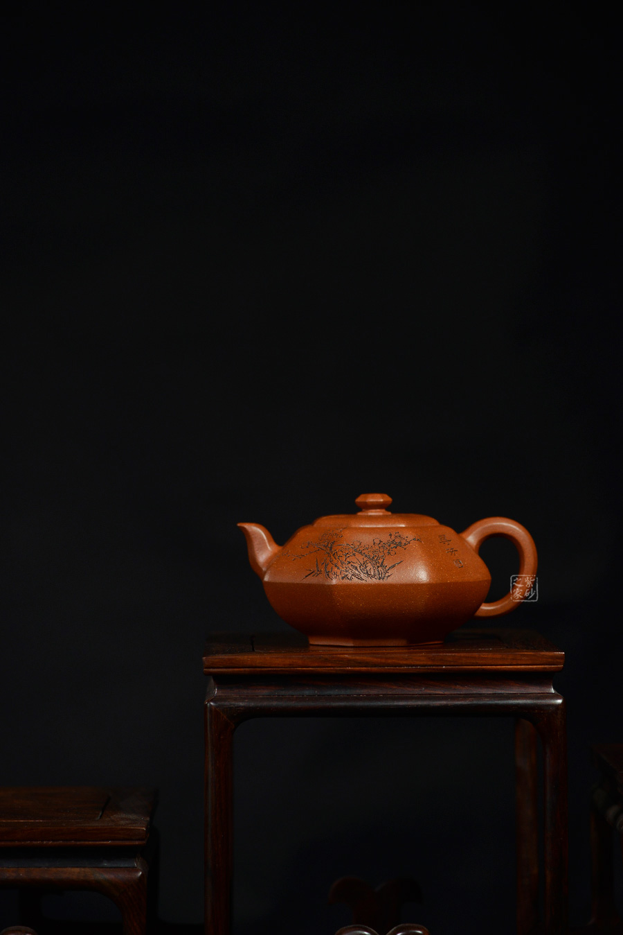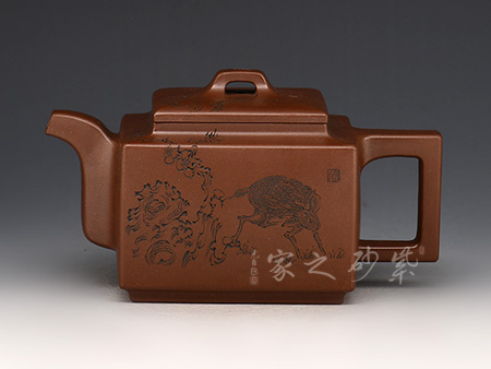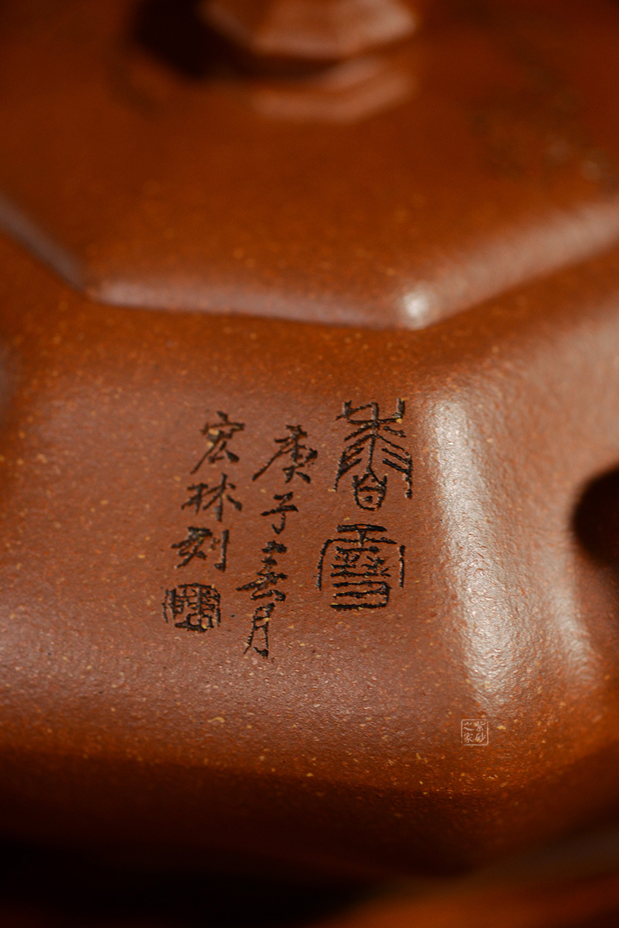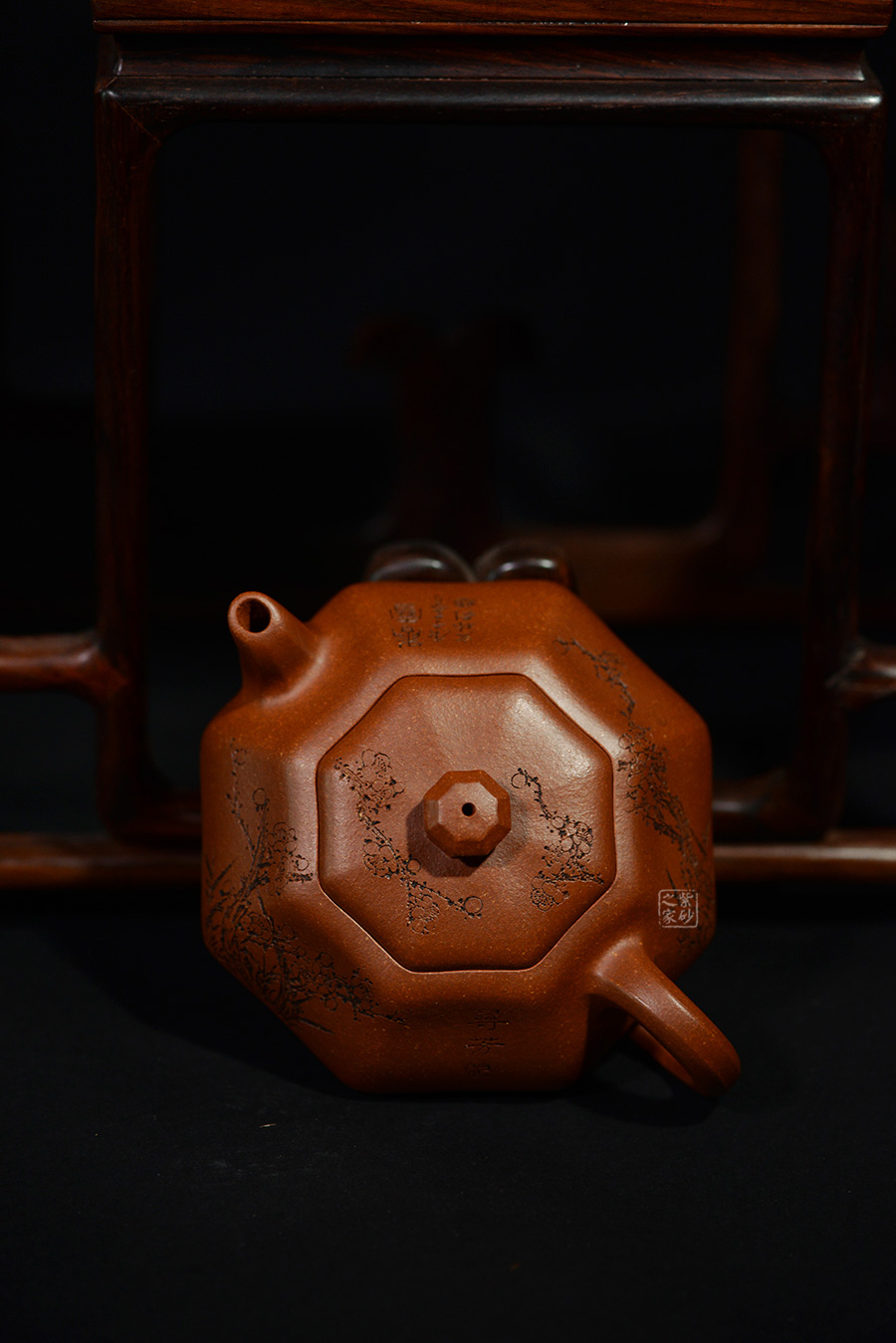 加之陶刻大家陳宏林裝飾刻繪梅花,一是風(fēng)骨,二是配合優(yōu)質(zhì)降坡泥所呈現(xiàn)出來的年代感,刻繪梅花效果更佳,更因?yàn)檫@把壺俯視看狀若梅花,整體可謂脫俗樸雅,儀態(tài)紛呈,大雅而深意無窮。