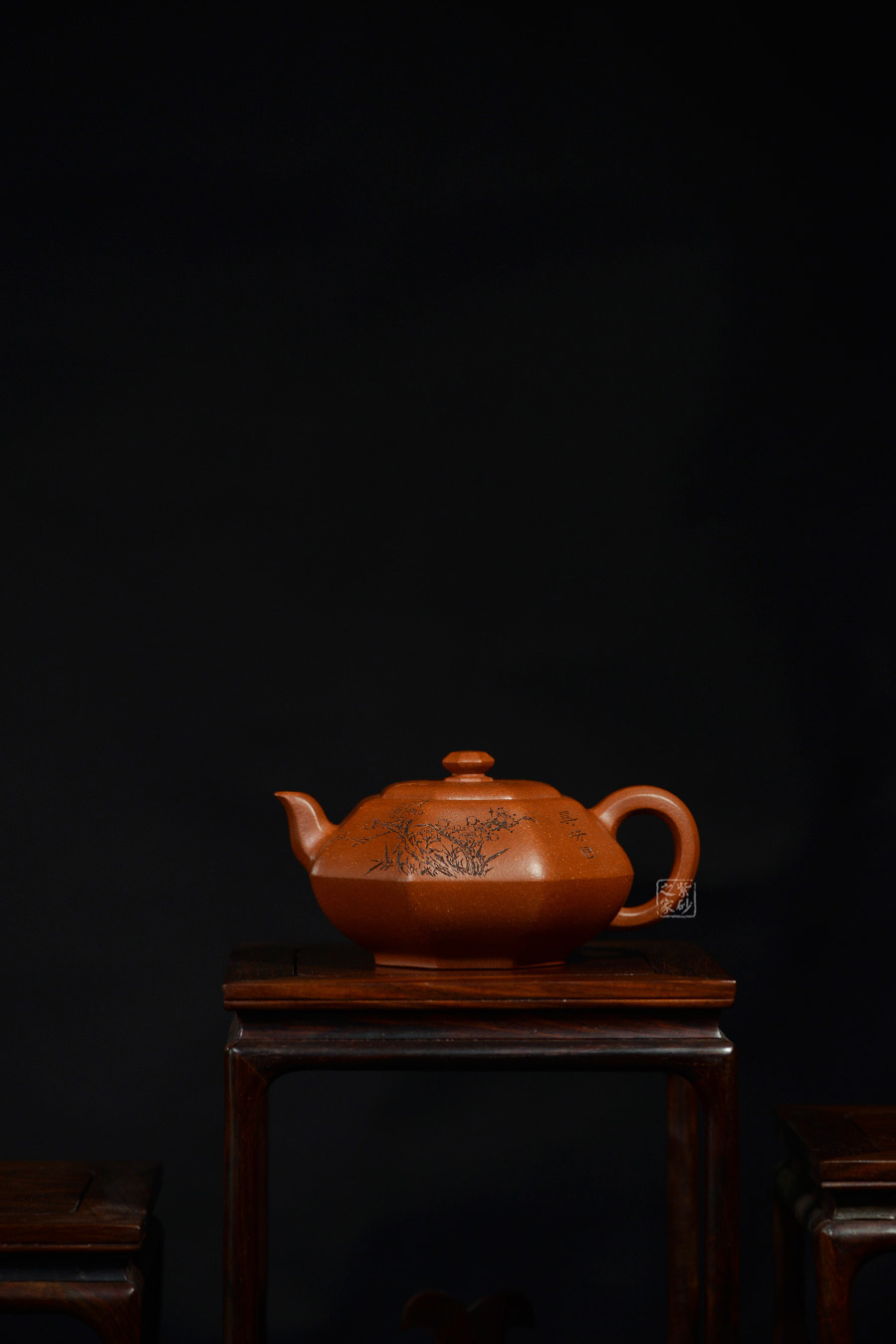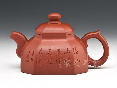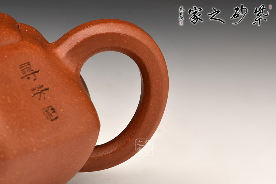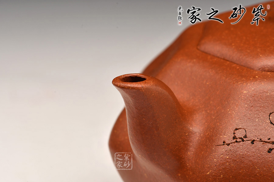 八方器型是紫砂方器中較為難見的一種器型。圓是柔,方是剛,通過曲與直,圓與方的對(duì)比運(yùn)用,體現(xiàn)出作品拙樸簡(jiǎn)潔,剛?cè)岵?jì)之氣韻。八方之中隱現(xiàn)圓擴(kuò)之美,這也是手工成型制壺才會(huì)形成的特定張力感覺。