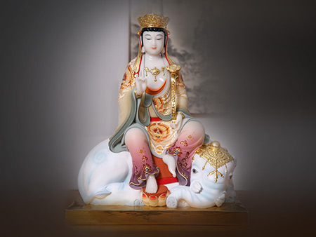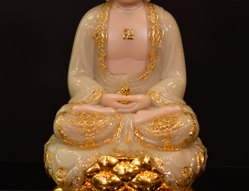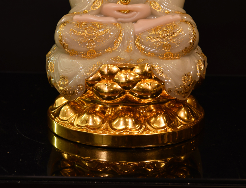 此尊觀音菩薩像以玉石為原料,表面采用鑲金工藝,再經(jīng)多道工藝流程制作而成。