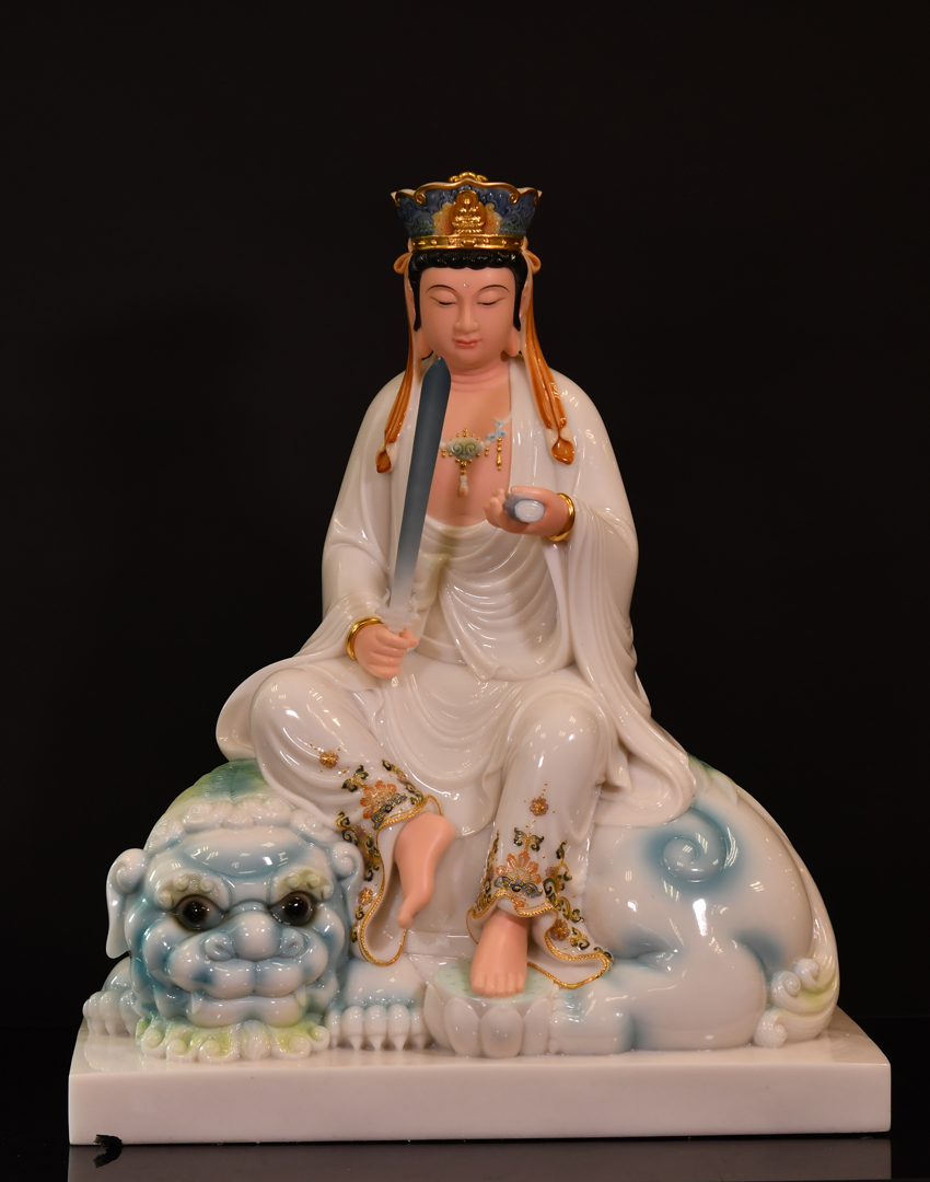 產地:福建 工藝:琺瑯彩 創作年份:2020 題材:文殊菩薩 繪制時間:0日 尺寸:*68cm 裝裱: 材質:人造玉 使用場地:
