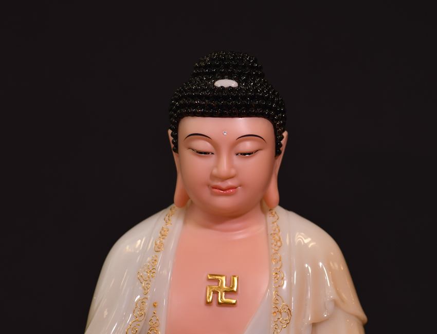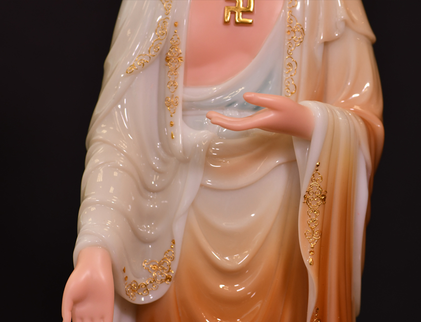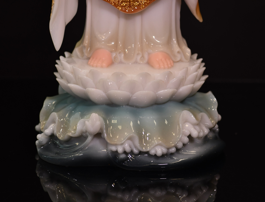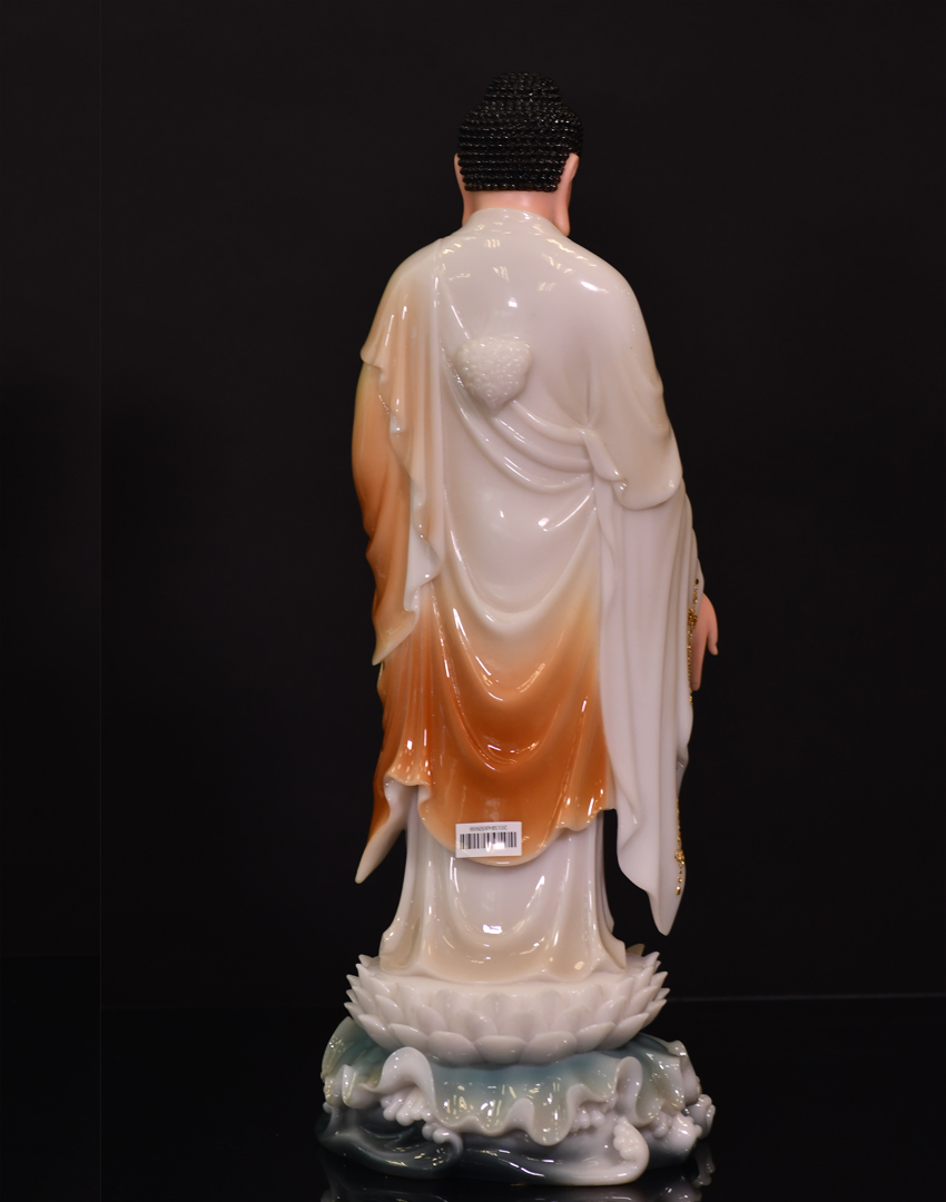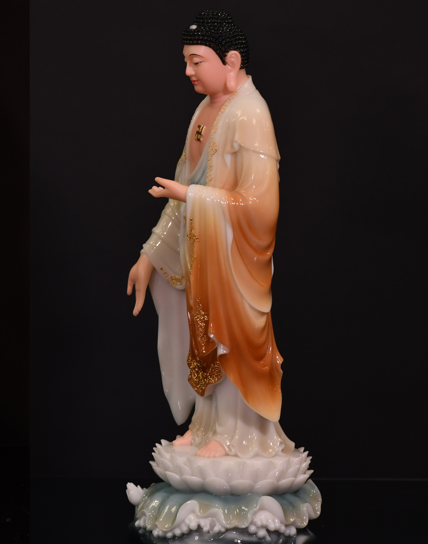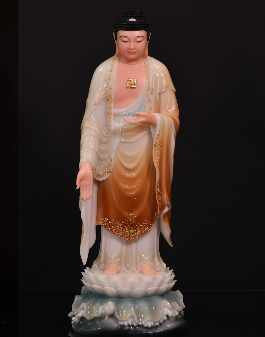 此尊佛像高度為48公分,站立佛形象,材質為玉石材質,用彩釉工藝制作而成。