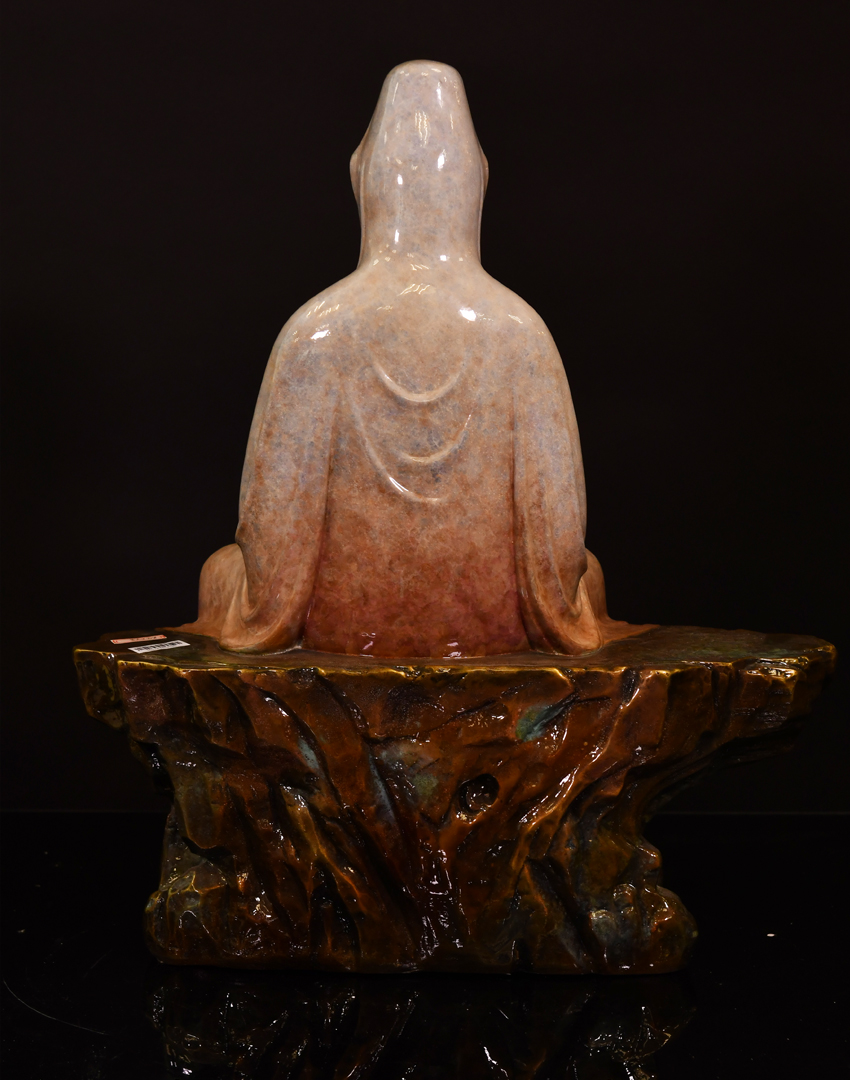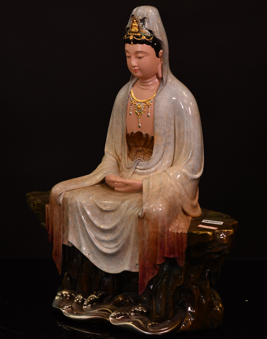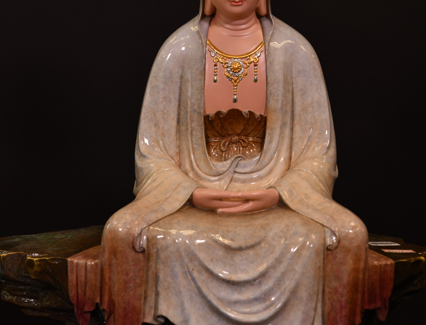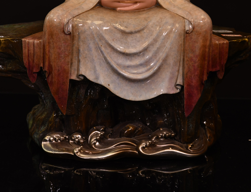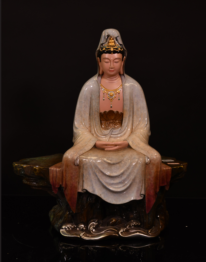觀音雙手結‘禪定’印,盤坐于高聳的巖石之上,巖石腳下是涌動的海水,一動一靜,更能體現(xiàn)出觀音的禪定和靜思。