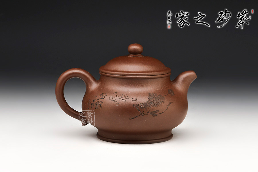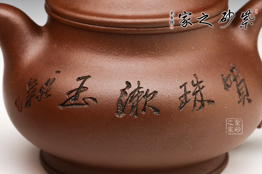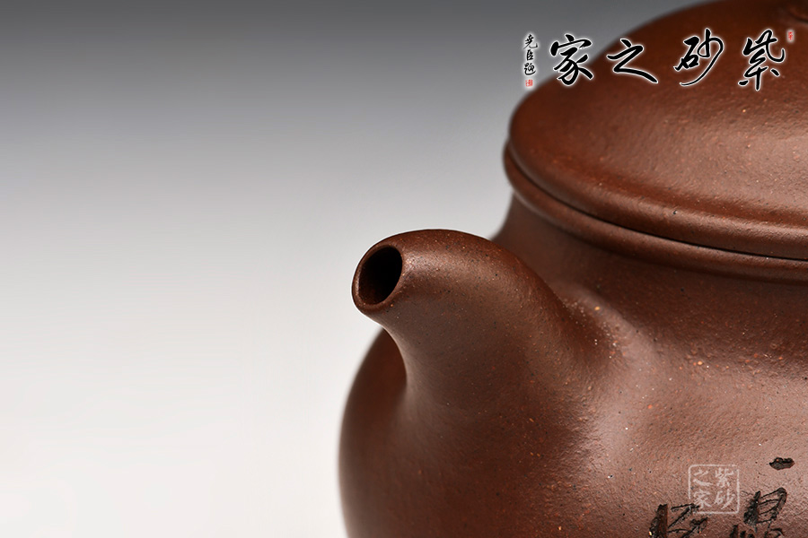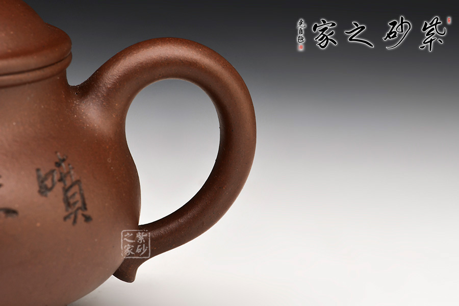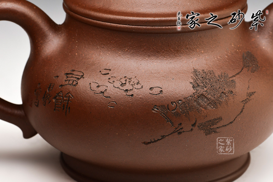 此壺圓腹,圓鈕,壓蓋,短曲流,圓耳把,矮圈足。壺身飽滿圓潤(rùn),氣韻豐茂,形神兼?zhèn)?,注重線與型的結(jié)合,表現(xiàn)出精氣神的完美和諧。