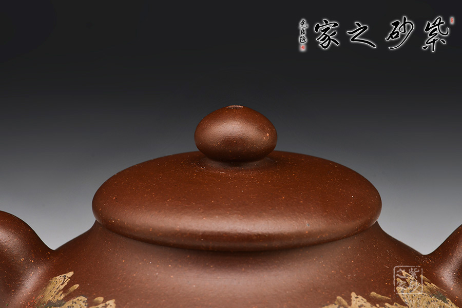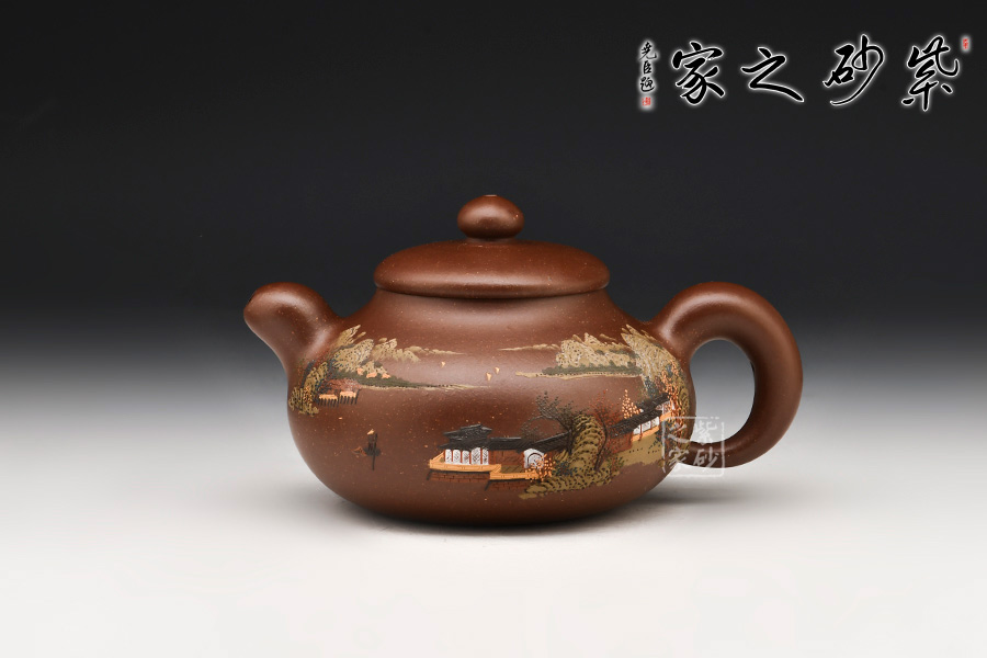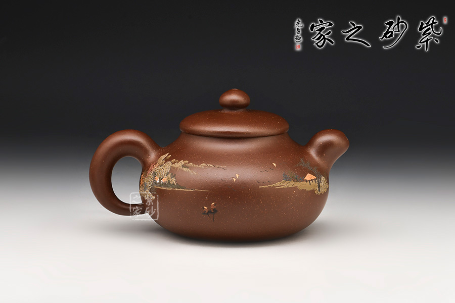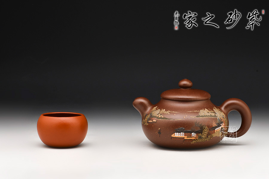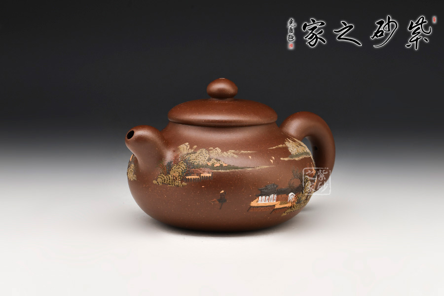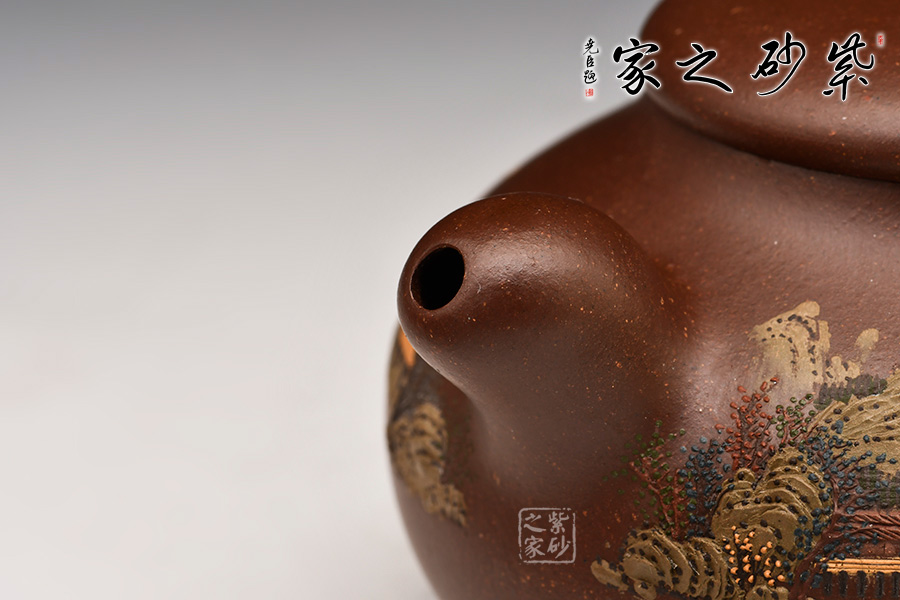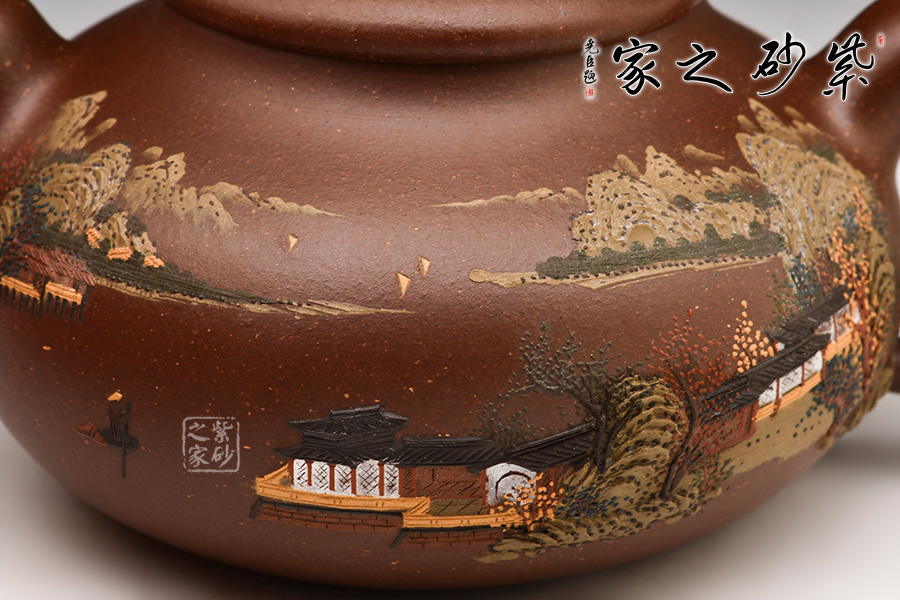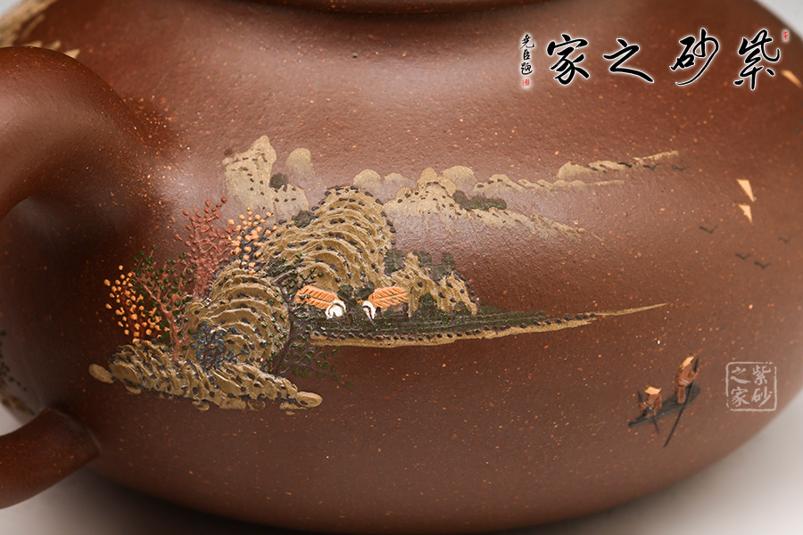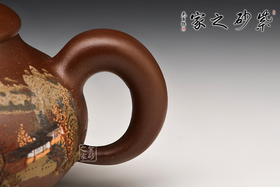 此款山水泥繪容天壺,實(shí)用性佳,輪廓敦厚圓潤、線條順暢柔和,壺身開闊似彌勒佛之坦腹,可謂“容天之肚、可濟(jì)滄?!?,相逢一笑泯恩仇的境界,通過此壺來表達(dá),已然淋漓盡致。