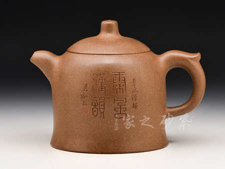 秦權(quán),俗稱(chēng)“秤砣”,既實(shí)實(shí)在在,又有分量,承擔(dān)著檢測(cè)分量輕重的標(biāo)準(zhǔn)權(quán),此壺便是將古代的“秦權(quán)”與紫砂巧妙的結(jié)合在一起,充滿了想象的意境和瀟灑不羈的情趣。