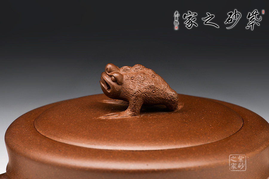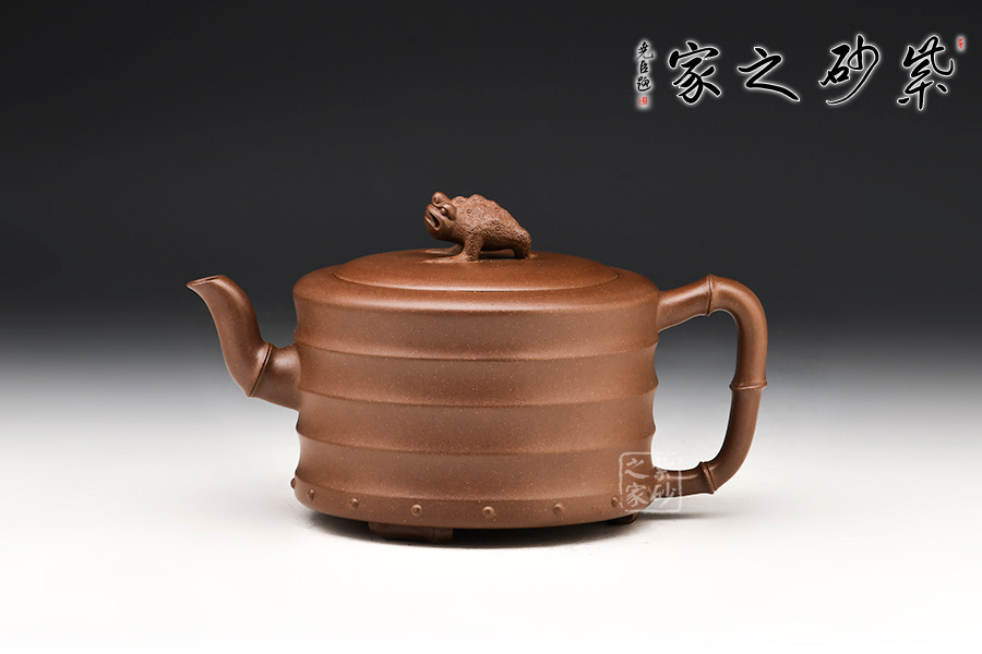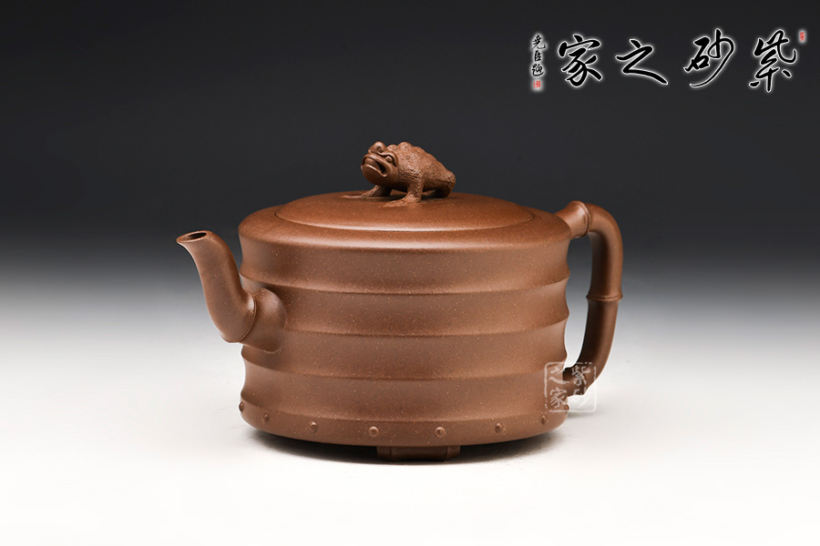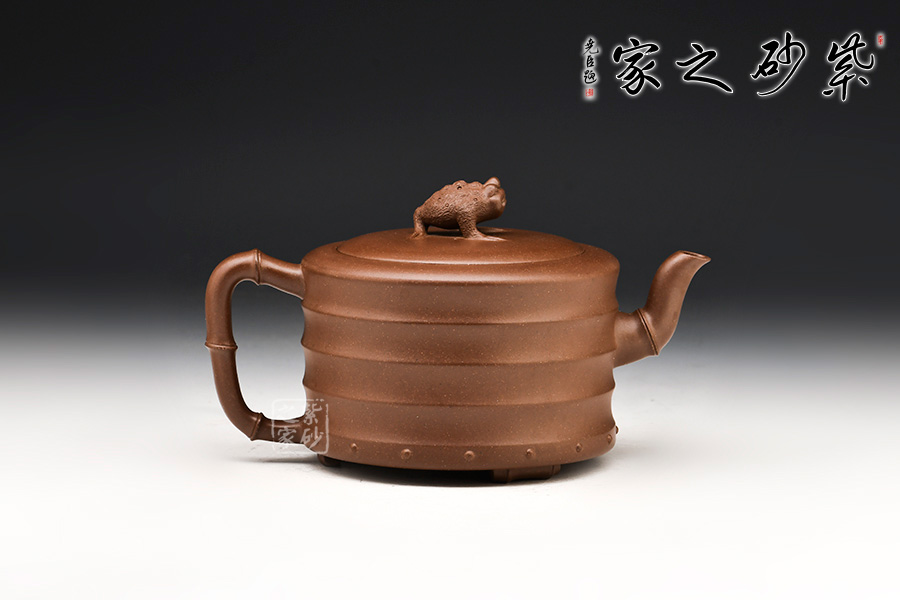 流把呈現(xiàn)竹節(jié)形狀,自然和諧,生機(jī)勃勃,還有蟾蜍形的壺鈕,碩大的嘴,暴突的大眼,以及喜氣洋洋的神氣,平添了一縷情趣,亦寓意財(cái)源興盛,生活幸福美好。